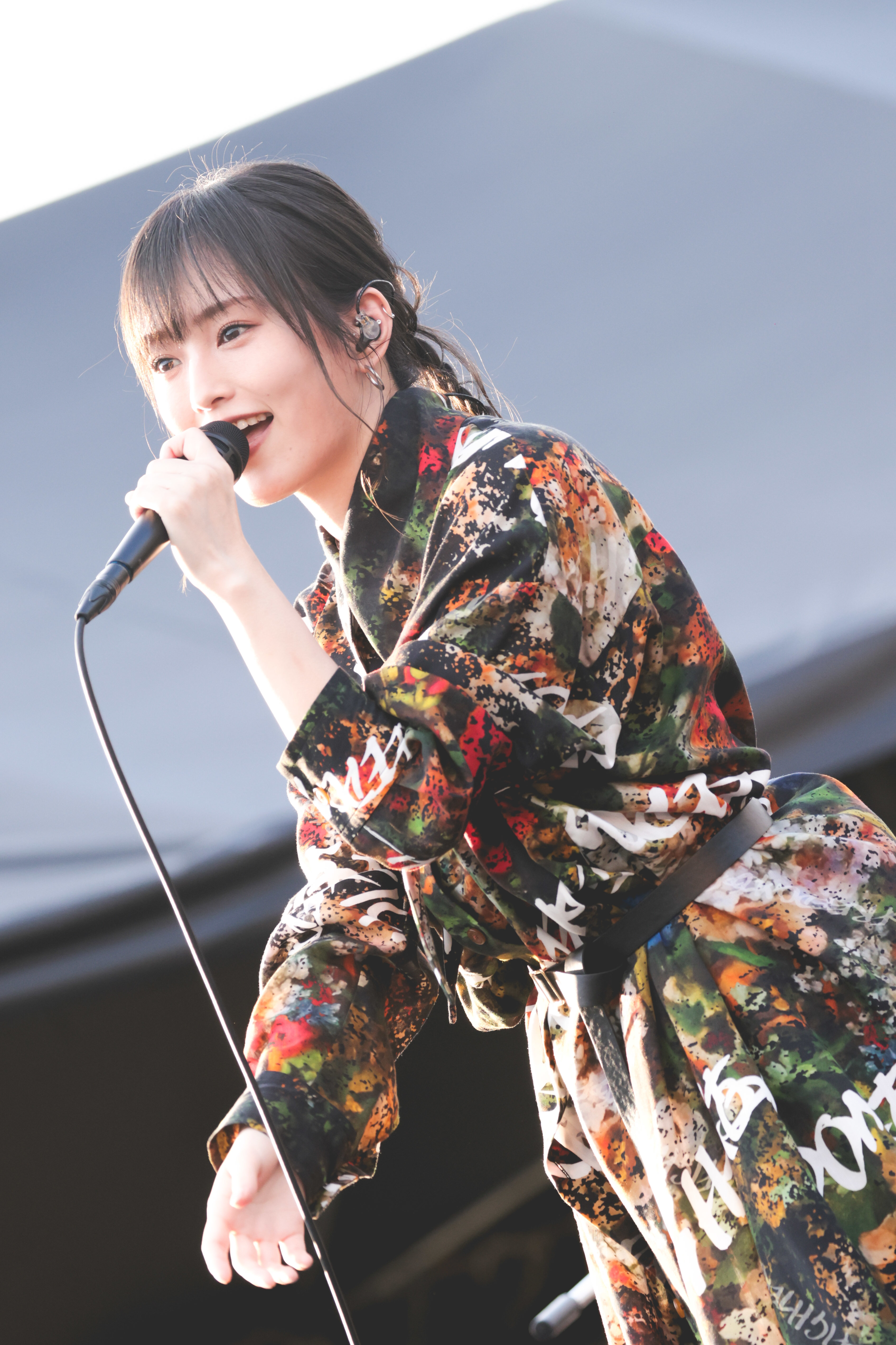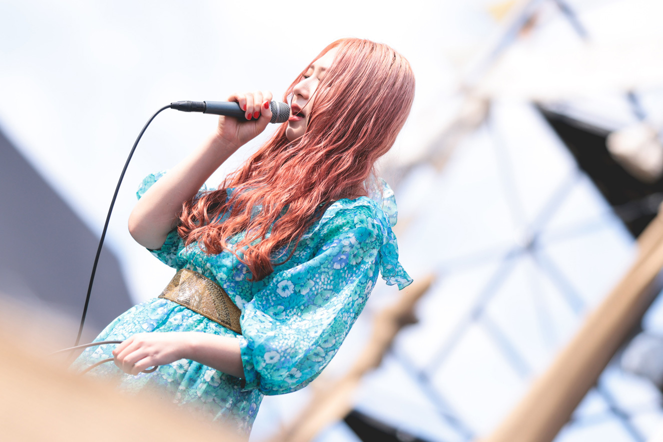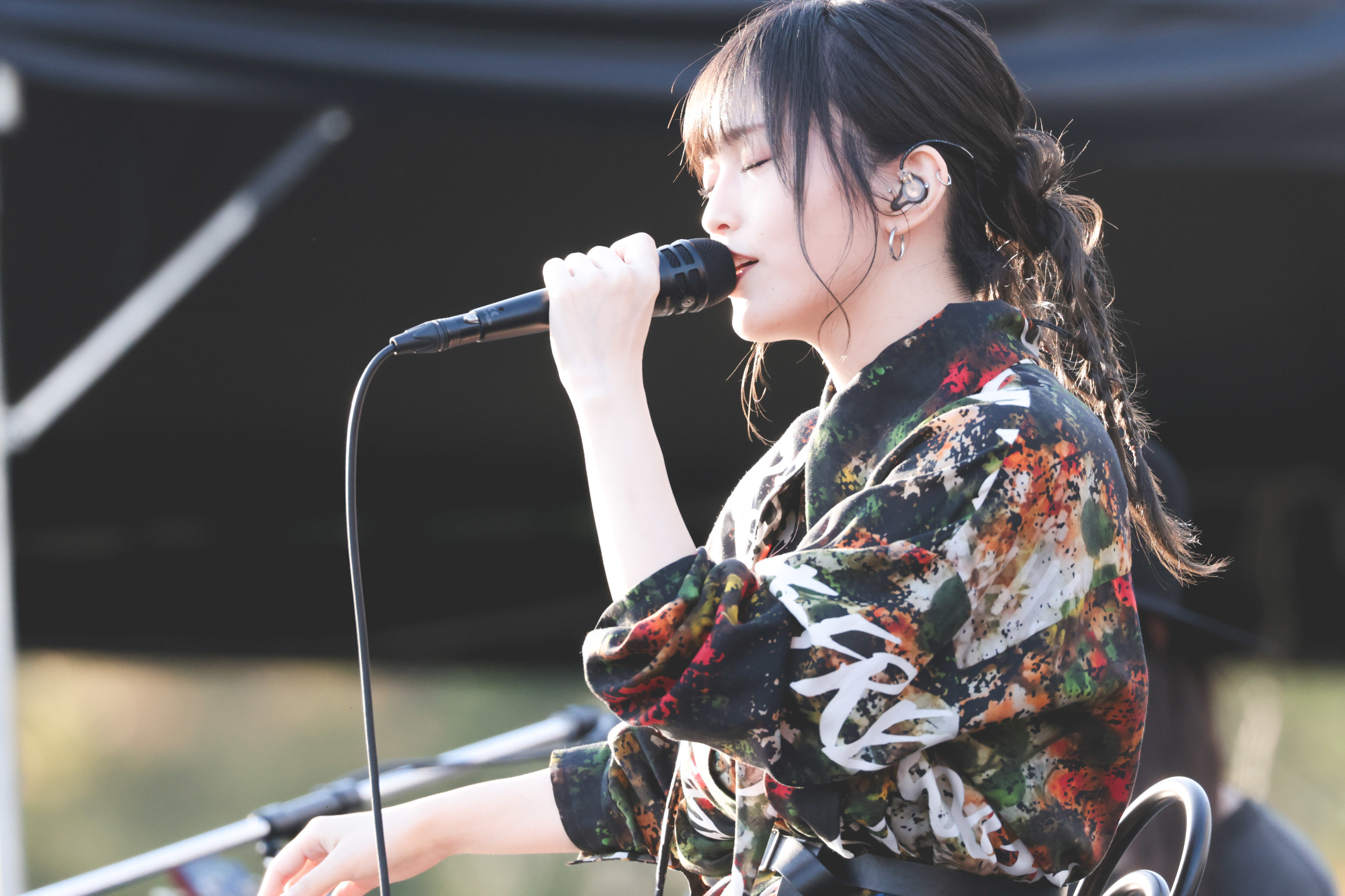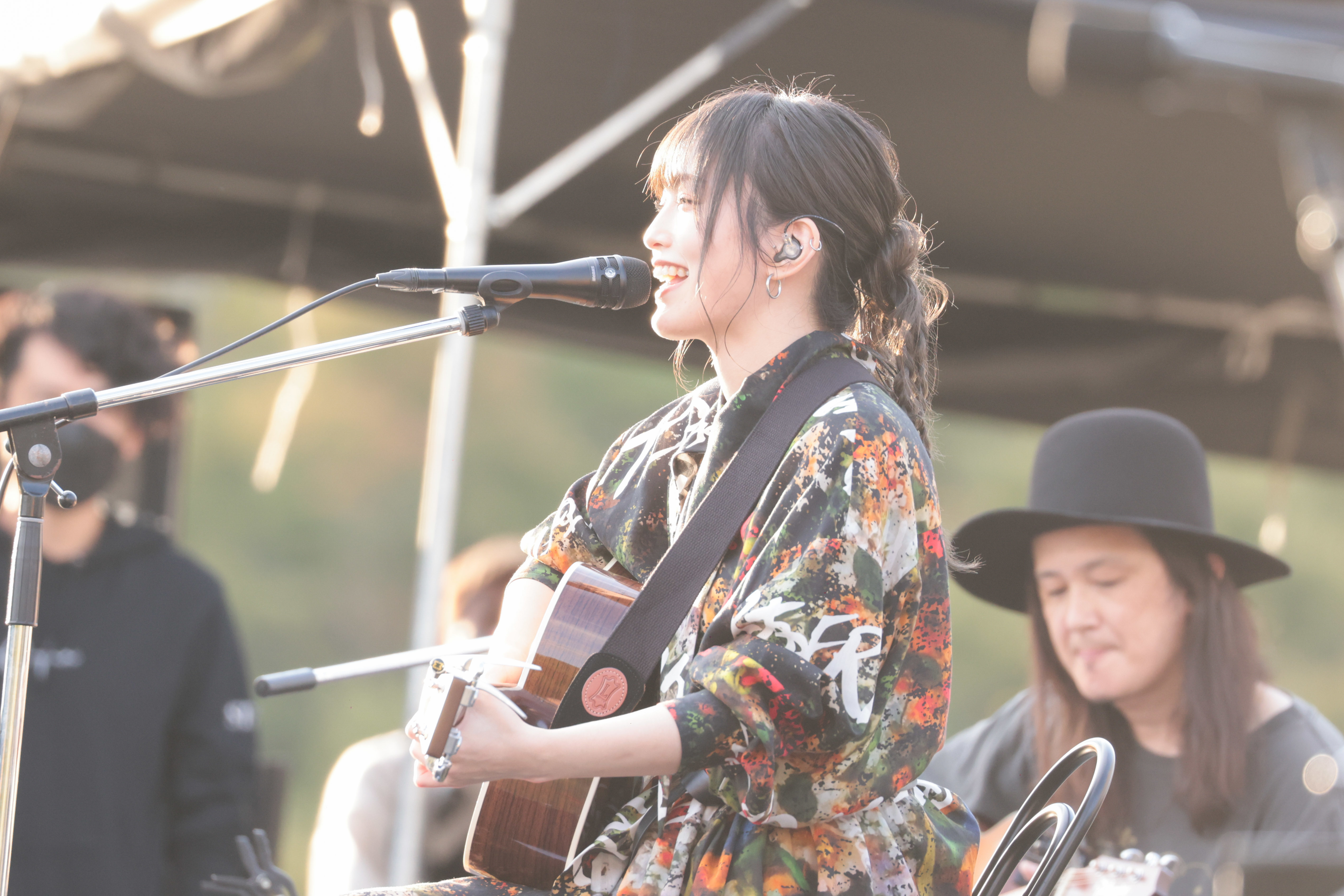 昨年報告された体調不良もあり、地元大阪でのライブはもちろん、有観客でのライブは約1年ぶりだという彼女。緊張感を持っての出演だったが、観客の温かい気持ちが嬉しいと柔らかな表情を見せると、観客も拍手で彼女の思いに応える。そして気合いも新たに、続く「yonder」では足元で力強くリズムを取り、「イチリンソウ」ではブレのない芯の強い意志を丁寧に綴っていく。