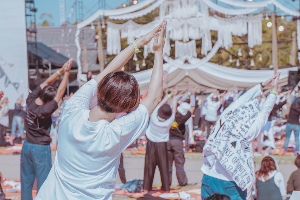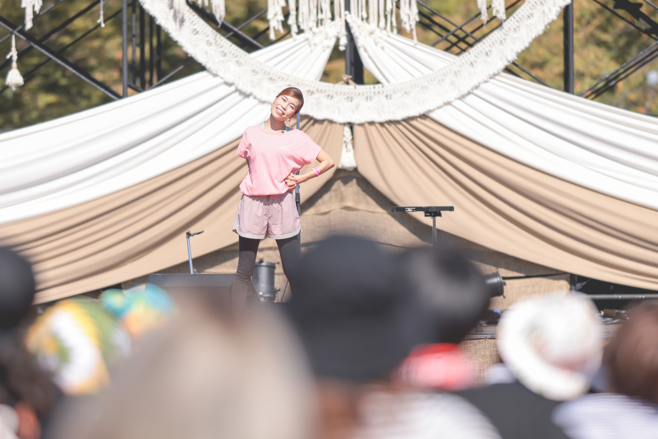 まずは、FM802のDJ・内田絢子による「モーニングヨガ」レッスンで、体も心もリラックス♪ 新鮮な空気を体いっぱいに取り込んだあとは、千葉県出身のシンガーソングライター・UEBOのライブからイベントがスタート。「一緒に楽しんでいきましょう」と、1曲目「Milk&Coffee」からソフトタッチな歌声で会場を包み込んでいく。