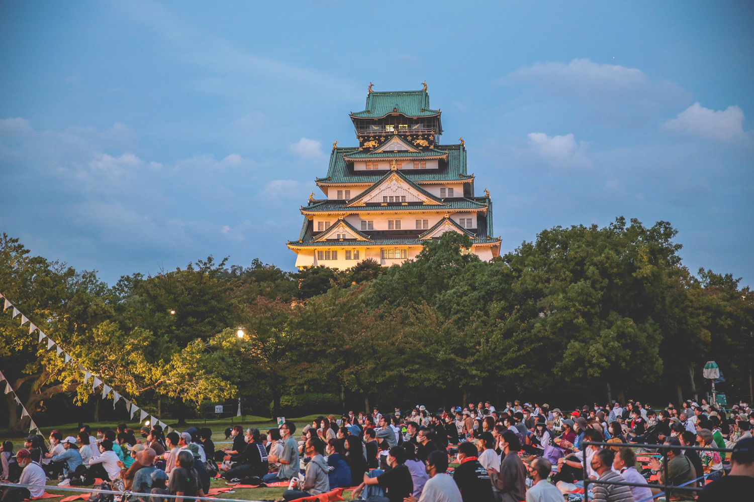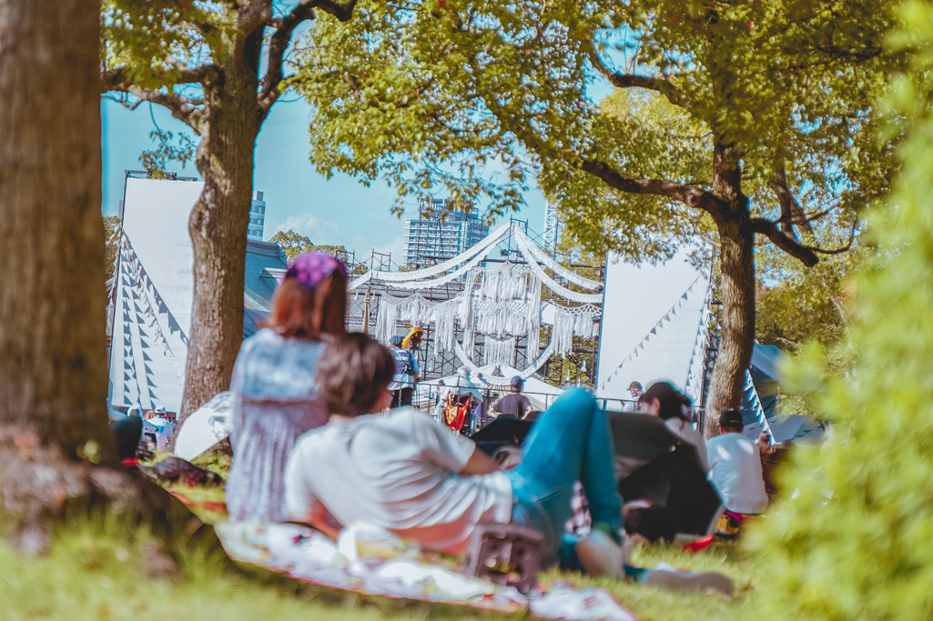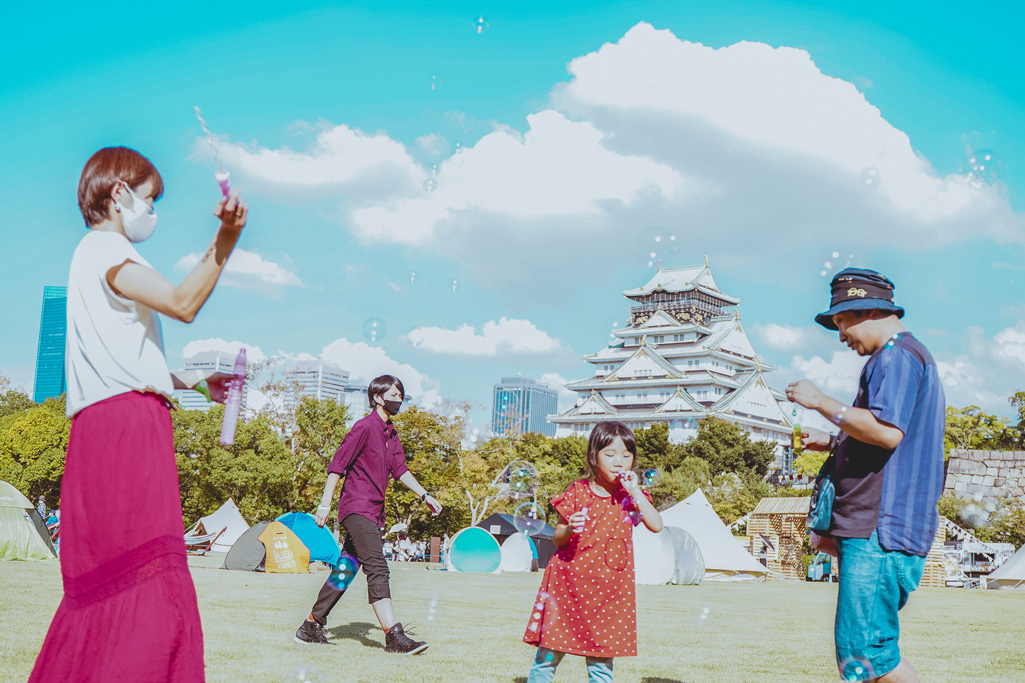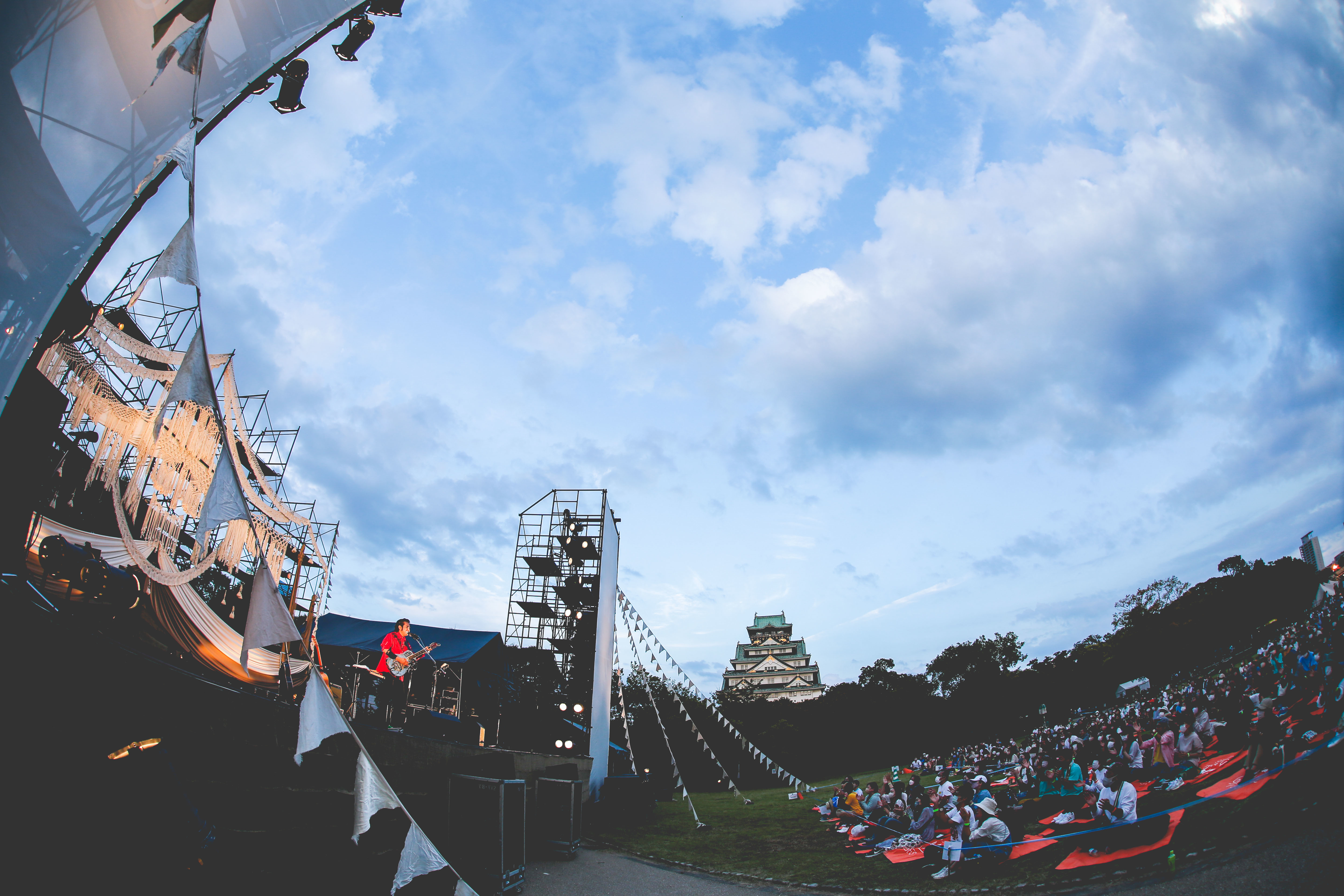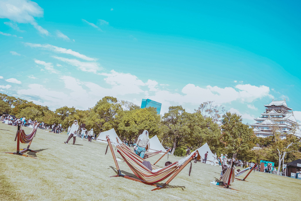 公園内の芝生エリアには自由に過ごせる大型テントやハンモックが設置され、ライブの合間にはヨガやスラックラインなどワークショップが展開され、フードブースではキッチンカーも登場。また、チケットには重要文化財に指定されている「大阪城の櫓」への入場料も含まれていて、観客は思い思いの楽しみ方でイベントを満喫していた。