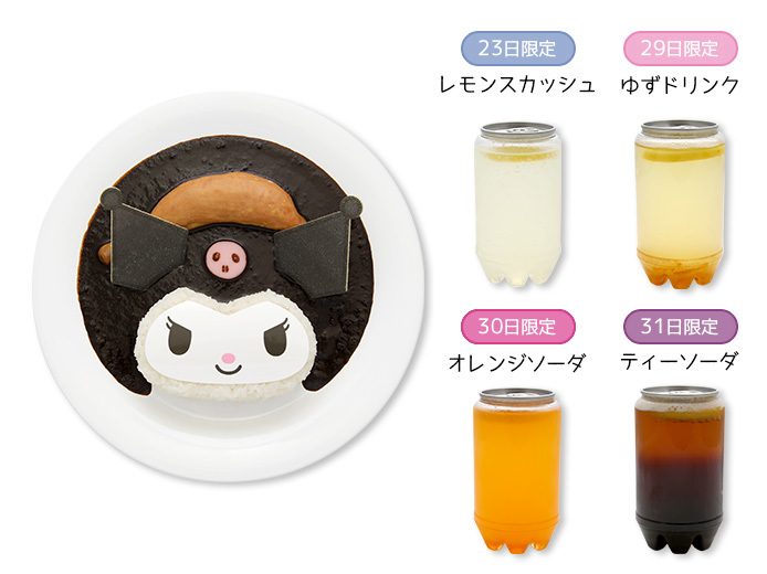 クロミはマイメロデイの自称ライバルで、10月31日が誕生日。その誕生日を前に、10月23日(日)、29日(土)、30日(日)、31日(月)の4日間限定でクロミのバースデーメニュー「クロミのバースデースペシャルカレーセット」が数量限定で登場。クロミの顔がインパクト絶大なブラックカレーと、日により種類が異なるドリンクのセット。特典として、ポストカードのプレゼントもある。