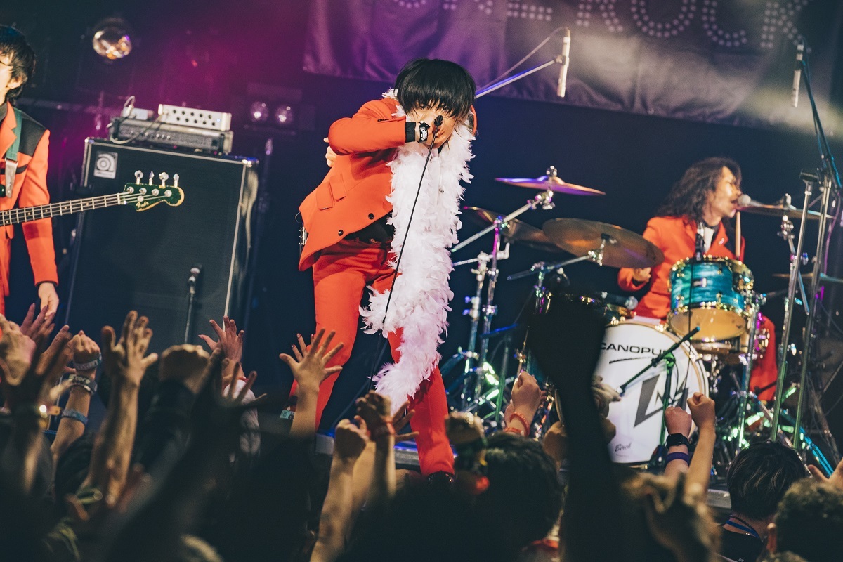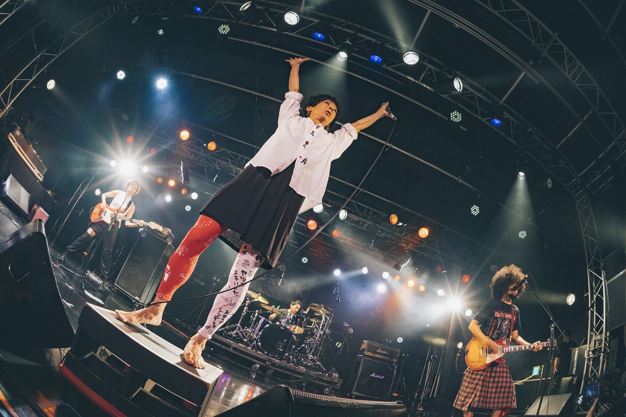 「今年はいつもどおりにやらせてもらいます!」と、白い羽根のマラボーを首に纏った水野ギイ(Vo)も気合十分。「ビレッジマンズ」ではスラップ奏法を交えたジャック(Ba)の低音がとりわけクールに映え、ゴキゲンなコーラスがあふれる「サーチライト」での一体感も泣けてくる。激しくもやさしい豪快なロックンロールが、感情の行き場がないオーディエンス全員を救ってくれているかのよう。
