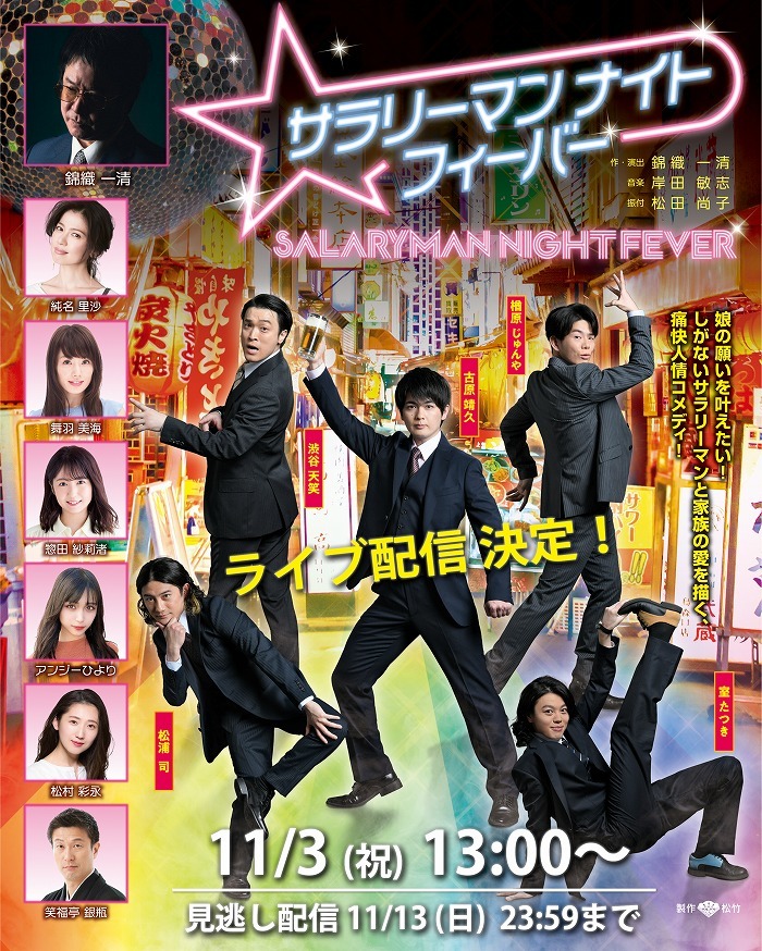 本日2022年10月28日(金)に大阪松竹座での初日公演を迎えたばかりの『サラリーマンナイトフィーバー』が、11月3日(木・祝)13:00より配信されることが決定した。配信限定の錦織一清特別コメント映像を収録のほか、初回配信では配信プラットフォームのチャットに出演者も参加予定だ。