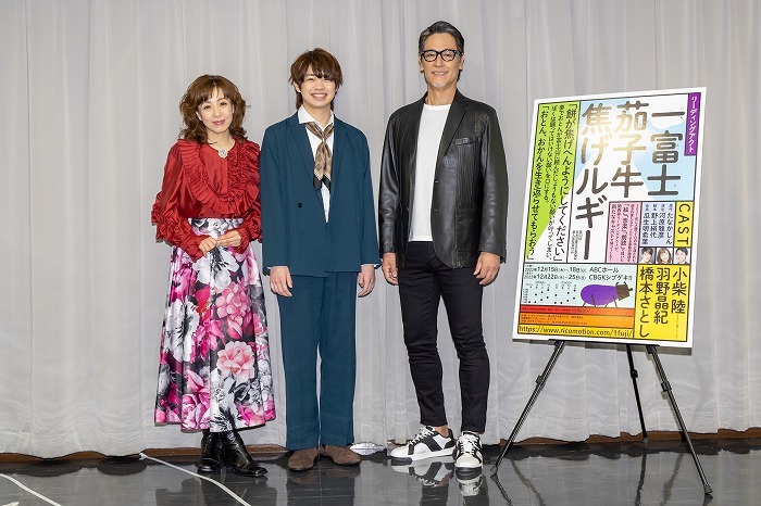 リーディングアクト『一富士茄子牛焦げルギー』が2022年12月15日(木)~18日(日)に大阪・ABCホール、12月22日(木)〜25日(日)に東京・CBGKシブゲキ!!で再演される。本作は昨年、1日だけ上演された幻の作品。今回、関西ジャニーズJr.の人気グループ「AmBitious」の小柴陸が“ぼく”役で続投、新たに“おかん”役に羽野晶紀、同“おとん”役に橋本さとしが出演する。再演決定に意気込む小柴と、新キャストの羽野、橋本、そして原作者のたなかしんが登壇した取材会は、舞台同様に関西弁がさく裂。笑いに包まれた会見の様子をレポートする。