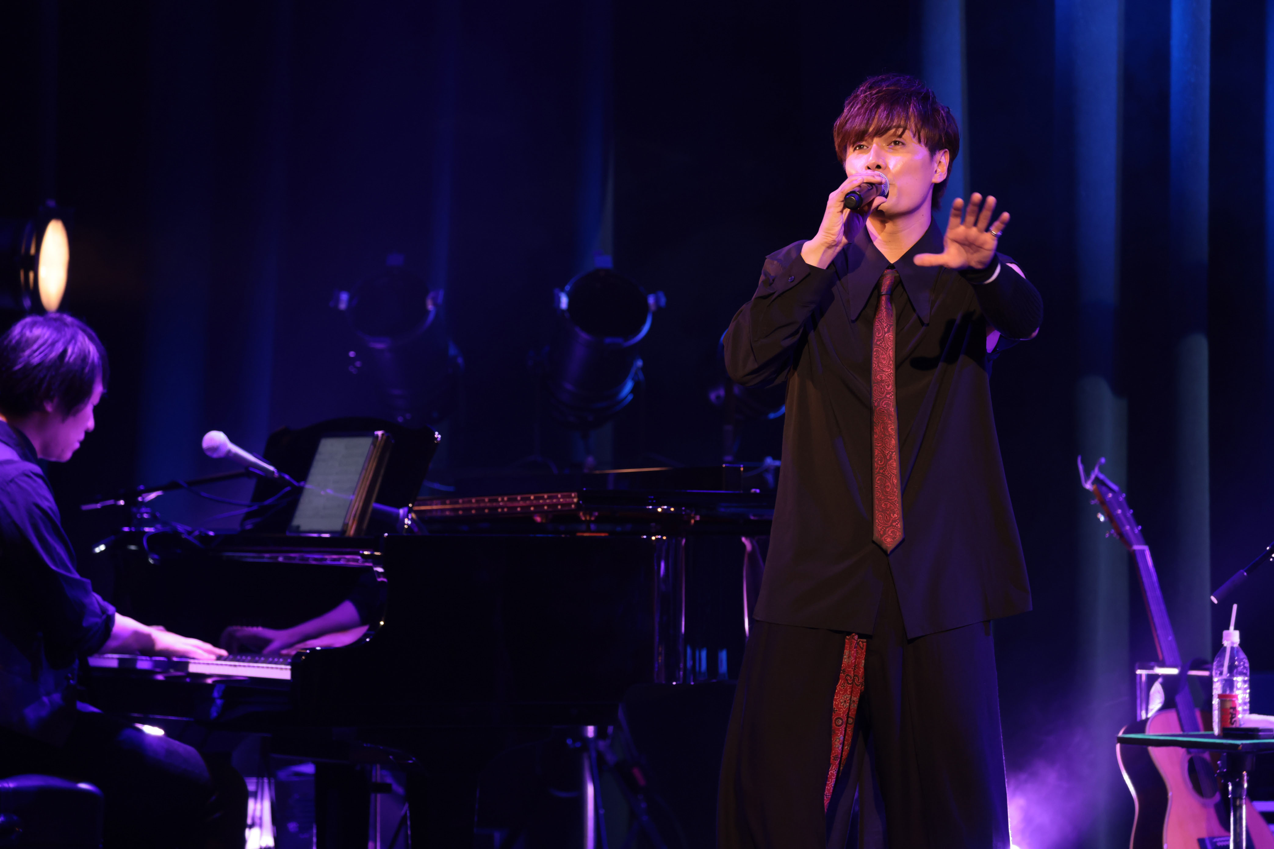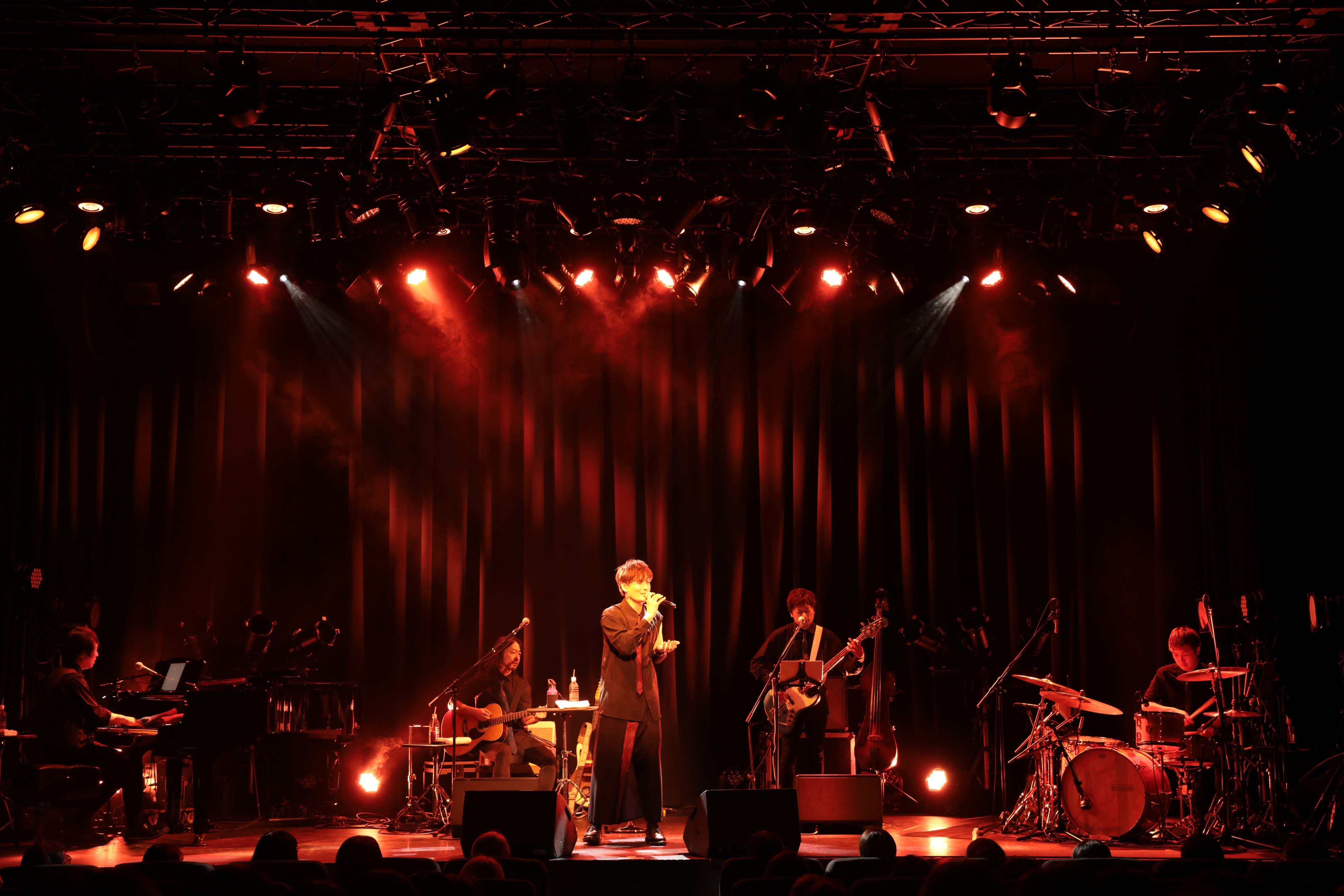コンサートは、加藤和樹&THE Sonics(Piano:吹野クワガタ Gt:田口慎二 Ba:川渕文雄 Dr:髭白健)のバンド編成。ジャジーにアレンジされたウォーキングベースのイントロの「Lost Time」でスタートした。マイナーキーのダークなベースラインから、ドラム、ピアノ、ギターが重なりバンドのグルーヴが構築されると、会場が一気に大人のサウンドに支配されていく。加藤和樹はTHE Sonicsの立体的な音像のなかで、自身の声の高音と低音を使い分けたボーカリゼーションで楽曲の世界観を表現していった。