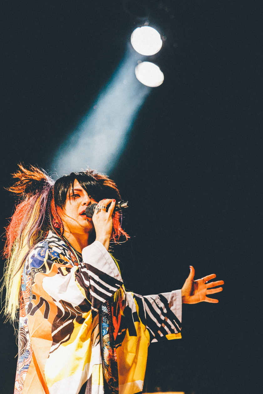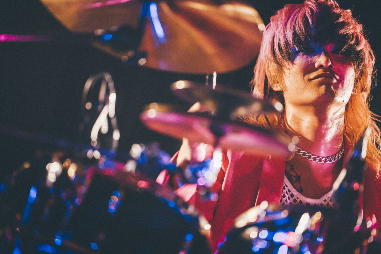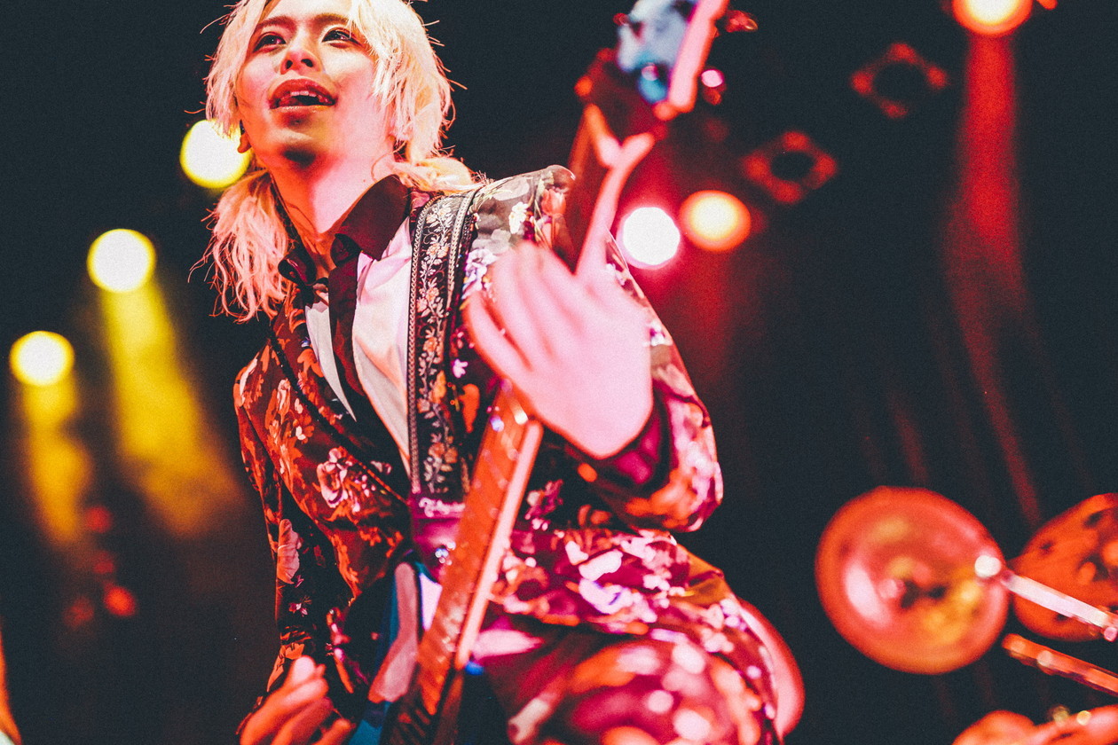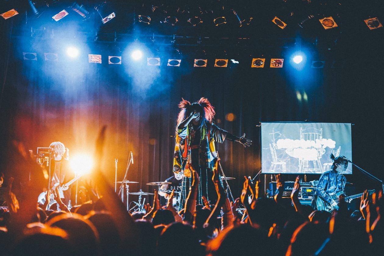 そんな回りくどい自己表現に徹したバンドの騒がしいパフォーマンスから一転、DEZERTはいつも通りのライブにスタートさせる。幕開けは「「不透明人間」」。これまでなんども原稿で指摘したことだが、彼らもまた大きな悲哀と屈託を抱えたバンドであり、千秋は“この世の生きづらさ”をヴィジュアル系という世界観の中でずっと描いてきた。つまり、夕闇の小柳とは対照的な方法ではあるものの、やっていることは2人とも同じなのだ。とはいえ夕闇とDEZERTではバンドのポテンシャルがまるで違うことを見せつけようと、ケンカ腰な演奏が痛快だ。なかでもSORA(Dr)とSacchan(Ba)による冷徹なビートには、貫禄すら窺えるほど。さらに印象的だったのは「Thirsty?」で見せたMiyako(Gt)の奔放なギターソロだ。ギタリストとしては比較的控えめな存在だった彼の中で、何かが今変わりつつあるのかもしれない。アプローチがヴィジュアル系としては斬新な「モンテーニュの黒い朝食」は、この対バンにどんな意図があるのか、を明らかにさせてくれる曲だった。ヴィジュアル系というシーンを逆手にとって生まれたこの曲は、その型破りなスタイルゆえライブではまだ消化しきれていない面もある。しかし、彼らがヴィジュアル系であることにこだわっている理由が明確になっている曲でもあることにも気づかされた。夕闇がコミック系バンドであることにこだわっているのと同じように、彼らはヴィジュアル系というスタイルを自ら更新していくことで、音楽の可能性やバンドの未来を掴み取ろうとしているのだ。