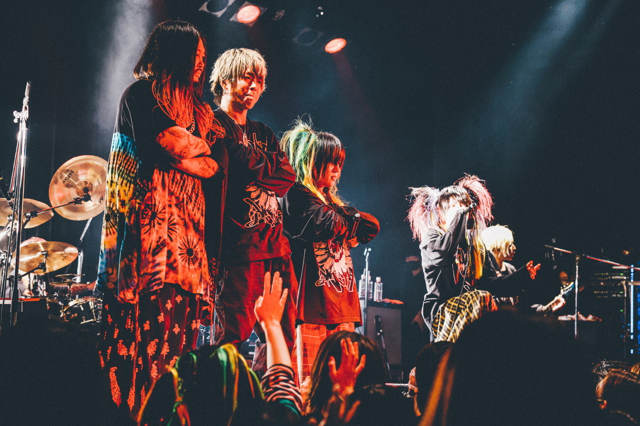 以前の彼はとにかくバンドマン同士がイチャつくことを激しく嫌悪していた。イベントで仲良しこよしぶりをSNSでアピールするバンドを忌み嫌い、そういった繋がりに中指を立てていたのだ。そんなヤツが今アンコールのステージで、誰よりも後輩を可愛がり、後輩の前でボケ倒し、それを義理堅く拾ってはツッコミを入れてくれる後輩のデレになっている。夕闇のカバーセッションを終えた後も全員での記念撮影はもちろん、千秋と小柳が撮ったプリクラをプレゼントするジャンケン大会まで実施。それは“人間とはいったんタガが外れると、どこまでも自分を許せてしまうものだな……”という感慨に浸るには十分の光景で、それほど彼らはお互いのことを理解し合い、強いリスペクトを持って付き合っている仲であることを理解した。開演から3時間弱、ようやく「「殺意」」で長いアンコールを締めくくった彼ら。ステージの去り際にファニーピースを決めるその姿を見て、DEZERTにとって今日の対バンは、いつか夢見ていた自分たちへのご褒美だったのかもしれない……そんなことを思ったのだった。