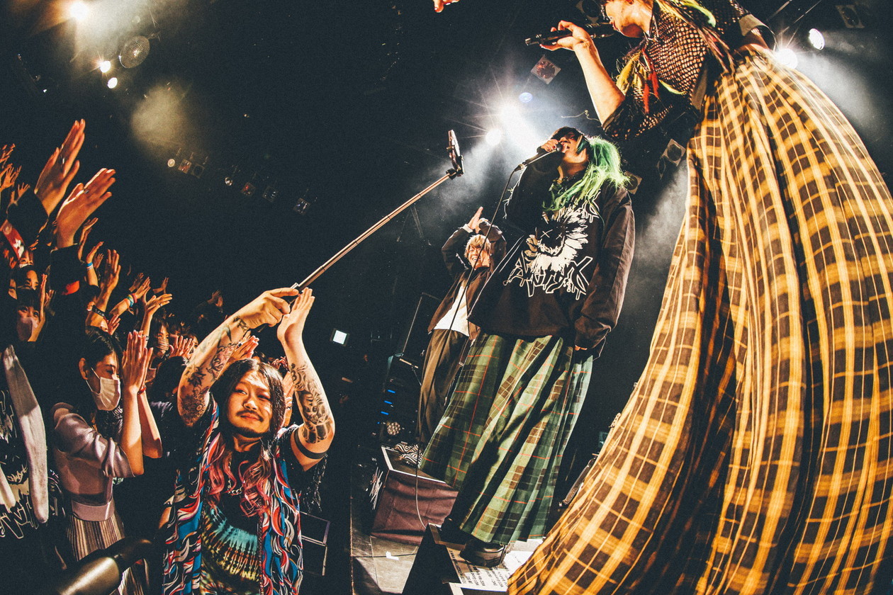 その一方で巨大なツインテールを振り乱しながら歌う小柳の存在感を筆頭に、メンバーそれぞれのキャラもしっかり立っていて、バンドとしての成り立ちが真っ当であることを実感する。各々が人を楽しませることや笑わせることに腹を括っているのがわかるパフォーマンスだ。そしてバンドのプロフィールに“ブス担当”と明記されている小柳は、ぽっちゃり型だった過去の自分と決別した(のかどうか知らないけど)ことによって、ブサメンどころかツインテールが似合うヴィジュアル系としてのメタモルフォーゼを遂げている。とはいえ彼らの武器は“お笑い”であり、それを過剰なバンドサウンドで増幅させることによって一点突破を目指しているようだ。DEZERTの「脳みそくん。」のカバーでは千秋(Vo)の飛び入りによって笑いの秩序が乱されるものの、あくまでも彼らは“コミック系ラウドバンド”であるスタンスを崩そうとはしない。自らを“お笑い”というテーマに縛りつけているのだ。