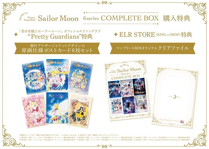 『美少女戦士セーラームーン』オフィシャルファンクラブ“Pretty Guardians”での購入者には、武内直子の原画イラストを使用した歴代アナザージャケットデザインの「原画仕様ポストカード6枚セット」、ELR STORE(KING e-SHOP)での購入者には「コンプリートBOXオリジナルクリアファイル」がついてくる。