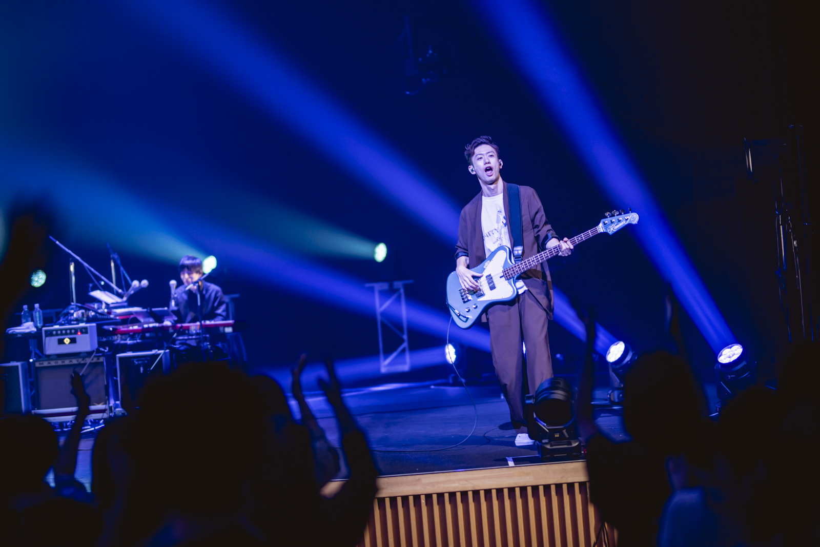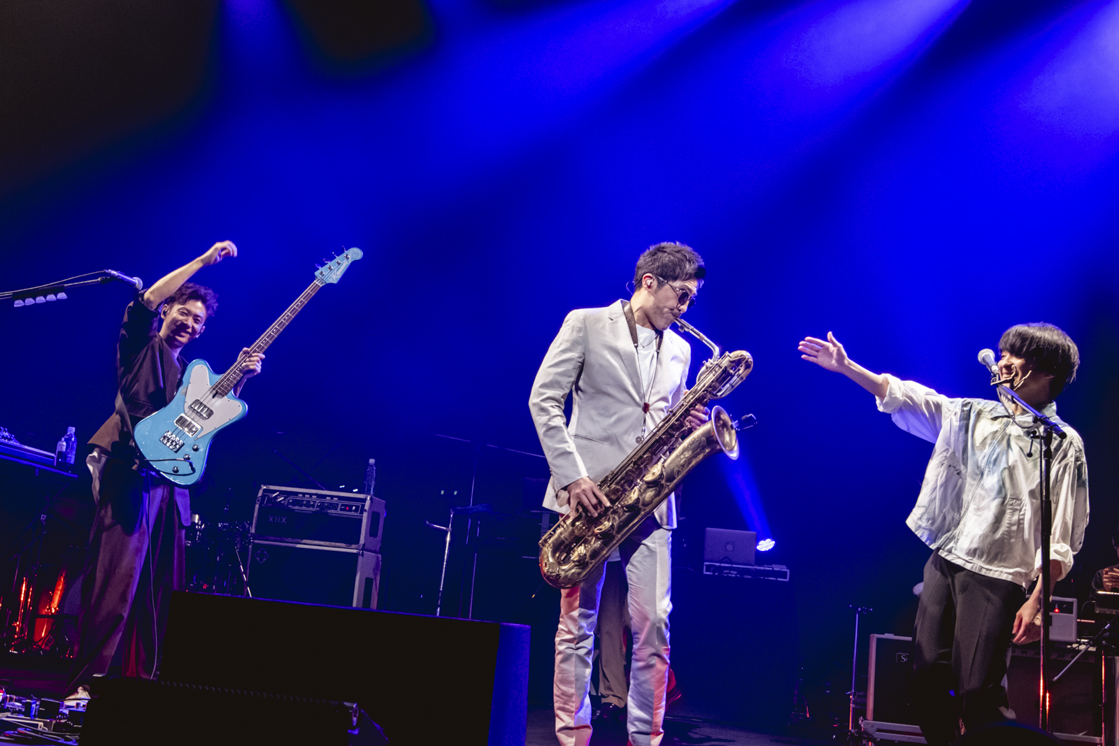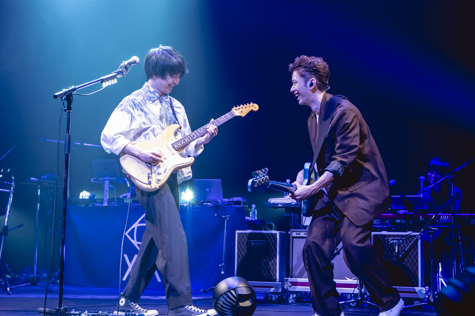 ドリーミーなエレクトリックピアノの音色がリードするメロウな曲調が、突如強烈に歪んだエレクトリックギターソロで眠りを覚まされる。「ZZZZZ」のトリッキーな構成は、いつ聴いてもスリリングでかっこいい。明るいディスコビートに彩られた「LIFE IS MUSIC!!!!!」では、須藤がステージ前に歩み出てオーディエンスにクラップをうながし、笑顔で斎藤と目くばせを交わす。さらに「E△7」「No More」と、明るく華やかなムードの楽曲を連ねてオーディエンスを心地よい一体感へ導く、セットリストの流れがとてもスムーズ。
