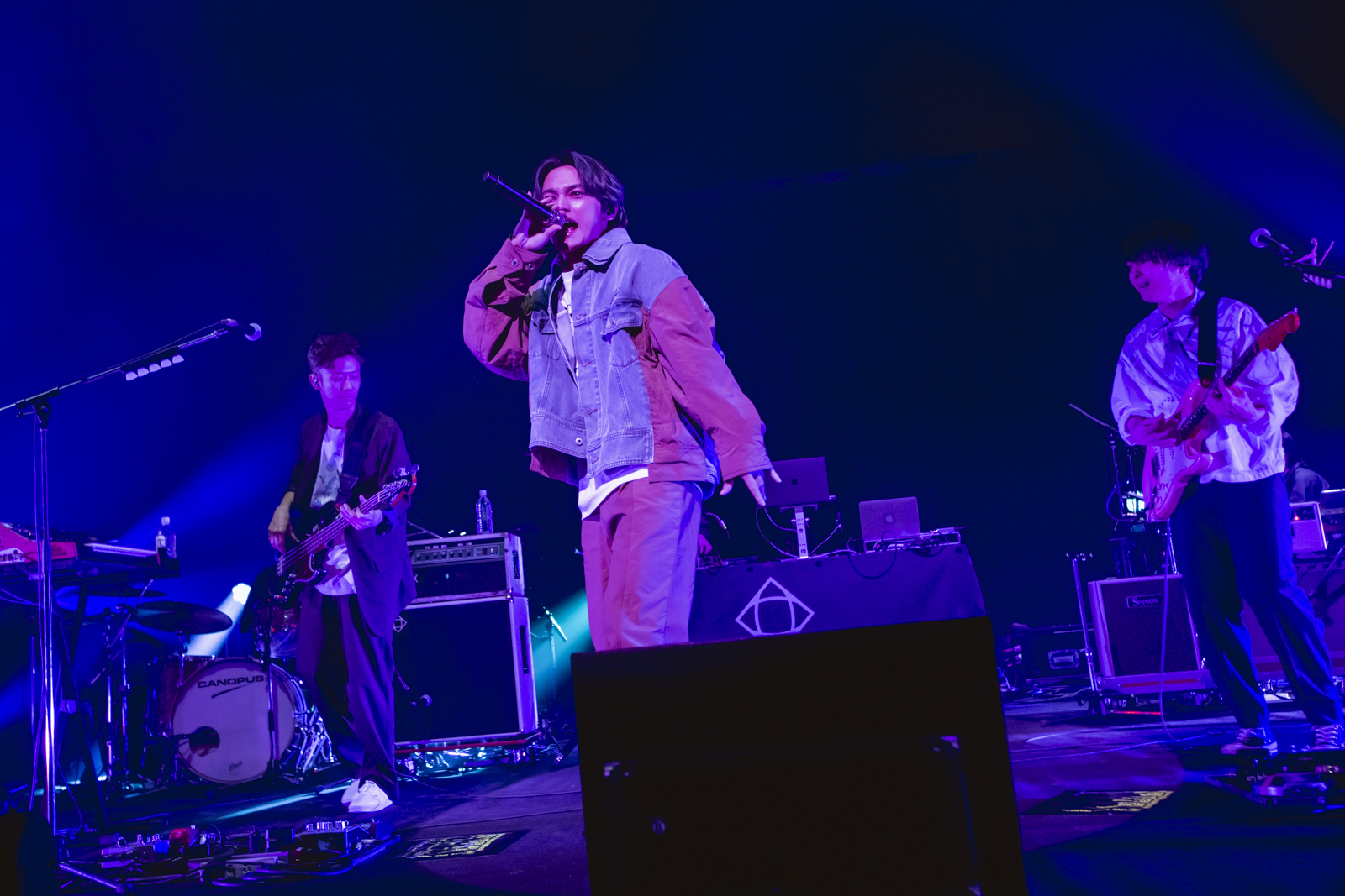 ライブ中盤は、1曲ごとに鮮やかにシーンが変わってゆくカラフルな展開になった。星を枝に宿した大樹のような美しい映像をバックに、静かなパートから分厚いバンドサウンドへとゆっくりと熱を帯びてゆく「ホロウ」。技巧的かつ情緒的、斎藤のボーカリストとしての天才が存分に発揮された素晴らしいミドルバラード「like the rain」。そしてぐっとテンポを上げたダンスチューンで、DJのスクラッチをフィーチャーしたソロプレーの応酬で盛り上がった「フラッシュバック」。須藤と斎藤の即興演奏にバンドが加わり一気にスピードアップ、ハイテンションで突っ走った「アカシ」。ぐんぐん高まる熱気の中、ライブはそろそろ終盤だ。