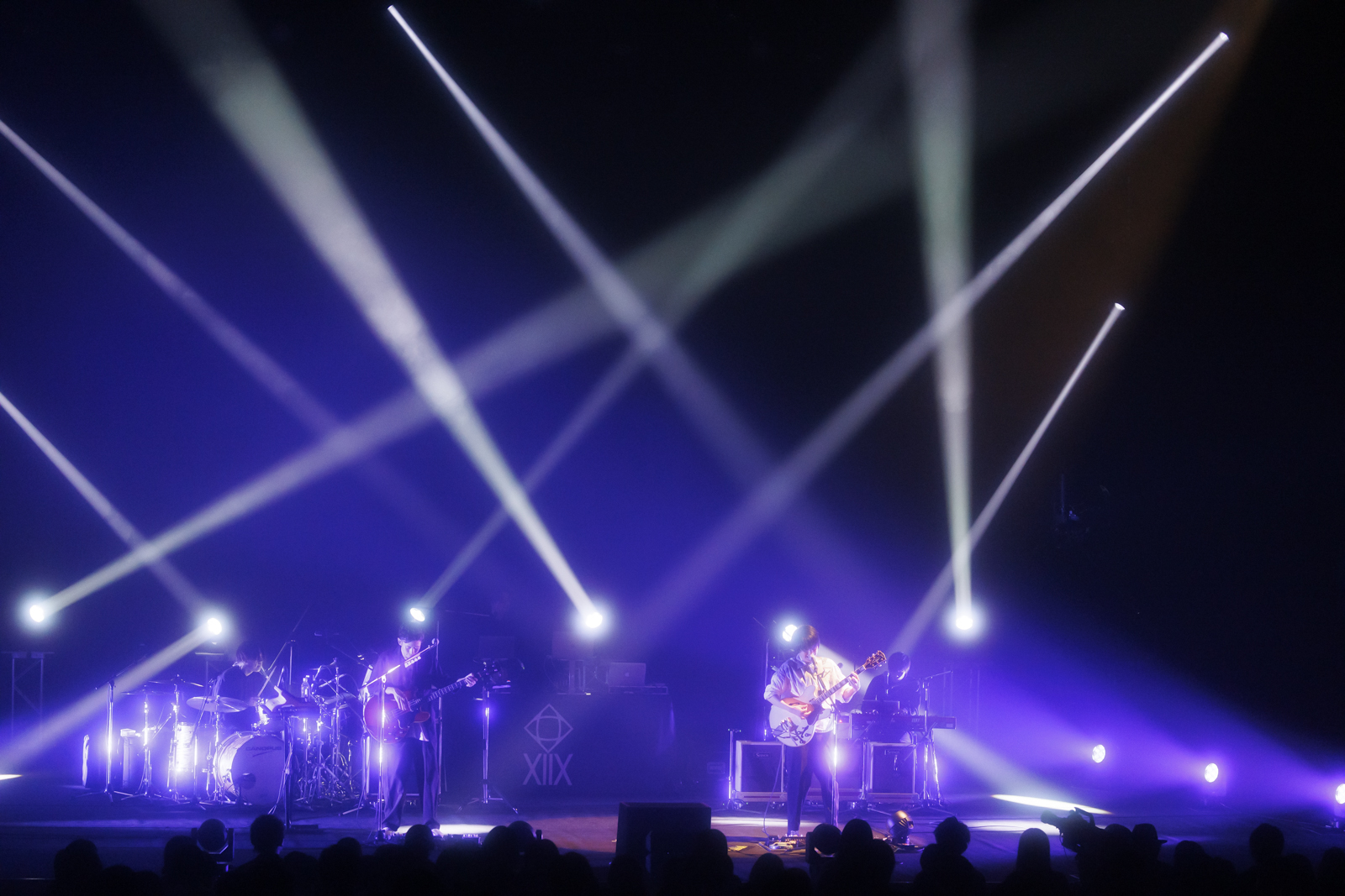 斎藤の短い挨拶に続き、サポートメンバーが加わった5人編成のバンドで奏でる「Stay Mellow」、そして「ilaksa」。ファーストアルバム『White White』の楽曲は、ライブで演奏し続けることで明らかにラウドでパワフルに成長している。須藤は生ベースとシンセベースを器用に使い分け、斎藤はリズムもリードもばりばり弾き倒しながら、一音たりとも歌のメロディを外さない。5人が入り乱れる、カオティックな楽器バトルが聴ける「ilaksa」の迫力もすごい。かと思えば「おもちゃの街」の、ノスタルジックな哀愁あふれるポップな歌もの路線があたたかく胸に沁みる。大胆と繊細、スリルと包容力。生きているバンドサウンドの脈動がしっかり伝わる、これがXIIXのライブパフォーマンス。