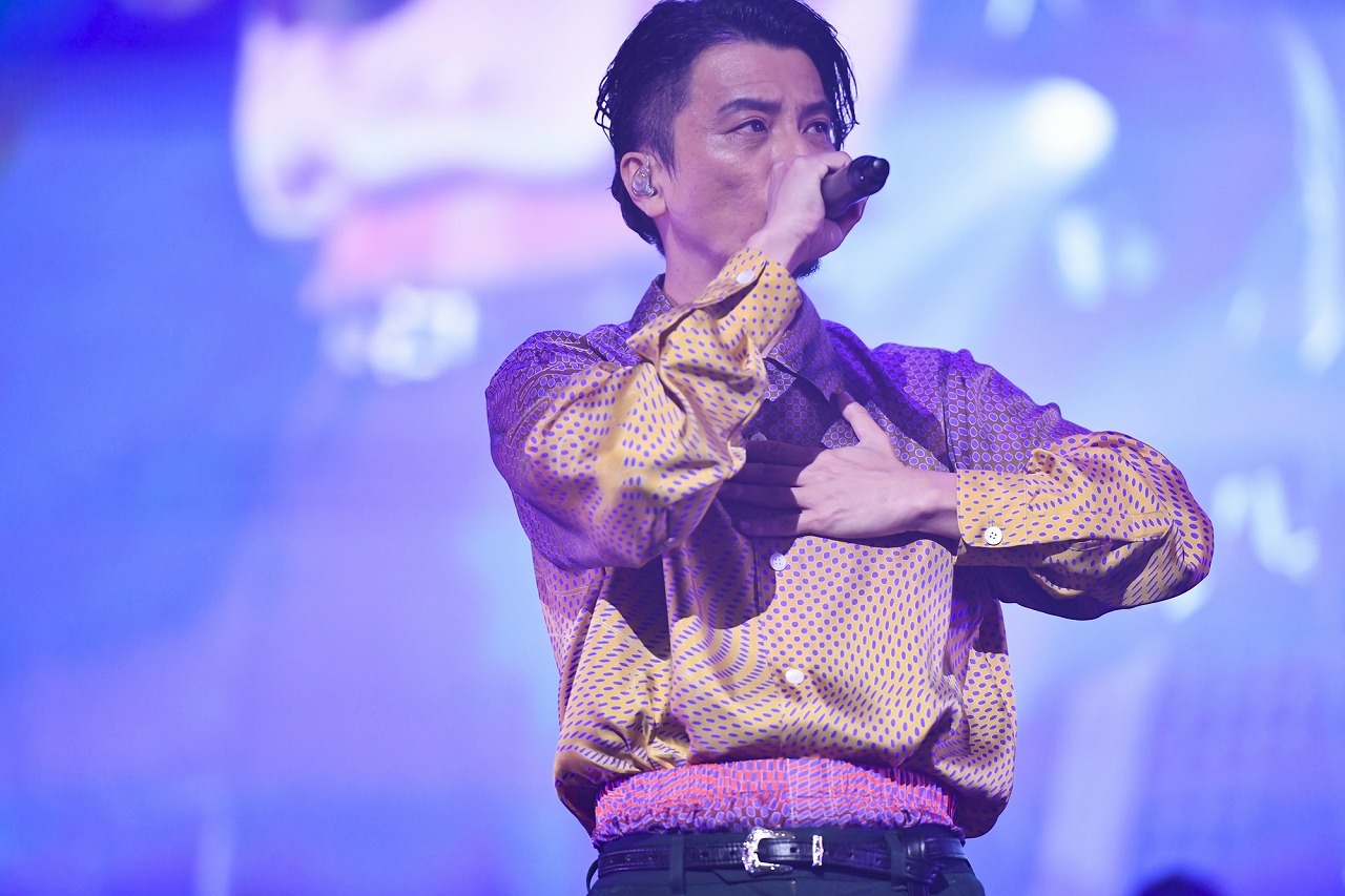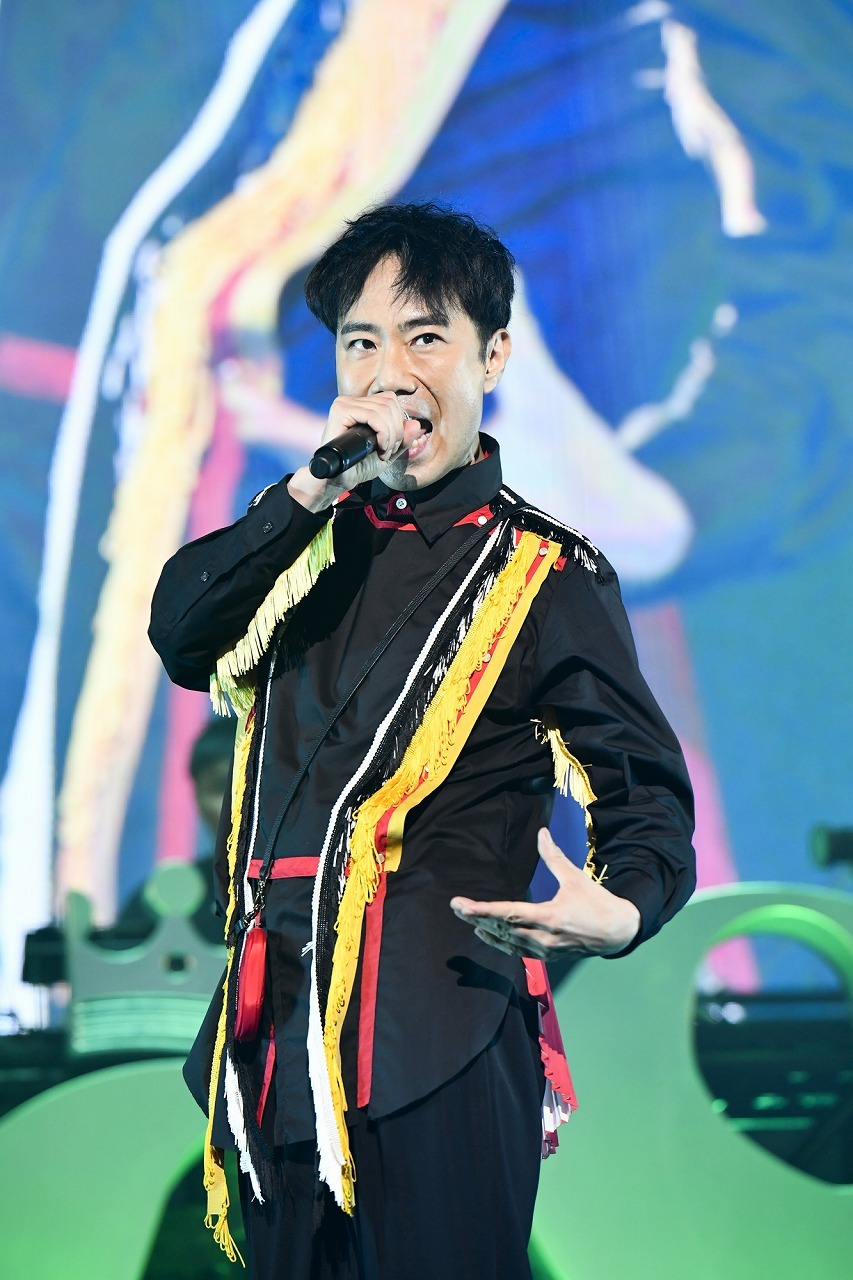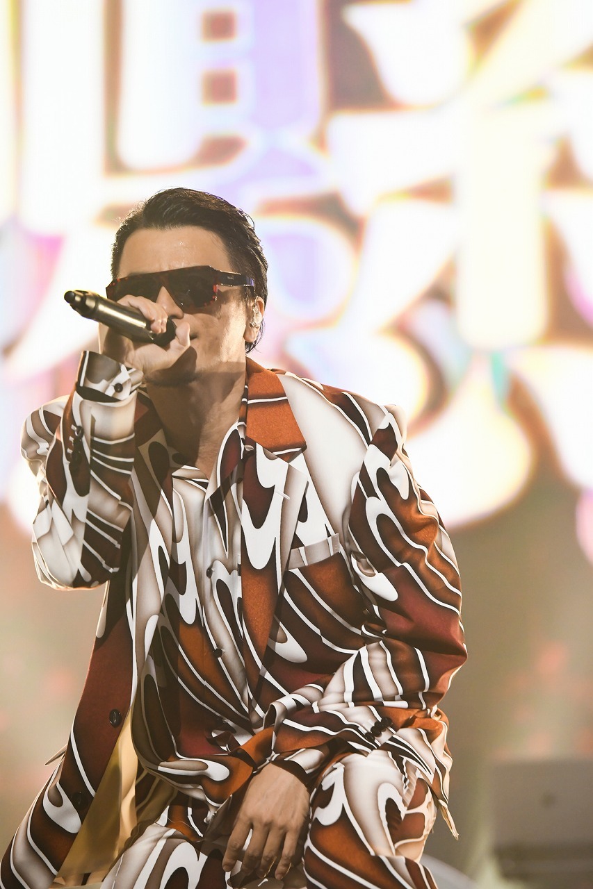 このあと、ステージは三浦大知へとバトンタッチ。ダンサーチームとともに「Blizzard 」を歌いだすと、《この胸にたぎる熱い炎》に合わせて、ステージ前後で客席まで熱波が届くような炎がバンバン上がる。曲のブレイクダウン、舞台は真っ白いスモークに包まれる。その巨大な白い壁を壊すように、三浦はマイクを持ちながらもう一方の手を使って、片手側転でそこから飛び出してくる。こんなアクロバティックなアクトのあとも、なにもなかったかのように息も切らさずすぐに歌唱を再開するのが彼の凄いところだ。続けて始まったソウルフルな「Touch Me」は三浦一人でステージの左右を動き回り、場内を盛り上げていく。生バンドのグルーヴにつられて放つ高音フェイクが華やかさを増していったところで、曲はブルージーなギターから大人のネオソウルバラード「About You」へと流れ込む。ダンサー2人が加わり、この曲最大の見どころとなる《寝ても覚めても》を小刻みに音符を刻んで、3オクターブを昇りつめていく離れ業は、歌唱力ある三浦の絶対領域。そこから「飛行船」へ。浮遊感ある音像からアッパーへ、動きも三浦の静なるソロからダンサー4人を交えたど迫力の群舞へと、静と動を緊張感たっぷりのテンションで行き来する芸術性の高いパフォーマンスは圧巻の一言。このただならぬテンションのアクトについて三浦は、自ら4曲連続でやらせてほしいとKREVAに申し出たことを告白。「でも、こんなに汗かく予定じゃなかった」と、勢い余って「162%ぐらいでやってしまった」と言って苦笑い。そうして、最新シングル「燦々」をハートフルな声で歌い、最後はKREVAの「イッサイガッサイ」を曲の後半、KREVA本人を交えながらカバーして場内を盛り上げた。