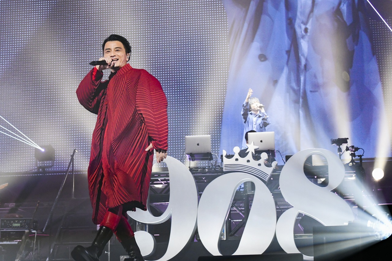 そうして、ライブはオンタイムでスタート。KREBandがオンステージした直後、後方から赤のオーバージャケットを着たKREVA が登場。オープナーは「クラフト」。サビ始まり、思わず体を揺らしたくなるミッドグルーヴが、開演前のBGMとスムーズにつながる。その上で、誰が聴いても分かるように、どこでどう韻を踏んでいるのかを所作、聞き取りやすい歌い方を構築して届けていくKREVA。《最近どう? なんだかんだあるけど武道館なら皆勤賞》は、KREVAソロ、『908FES』などこれまで30回以上武道館に立ったヒップホップ界の王者だからこそ歌えるフレーズ。そこから、この武道館でこそ聴きたい“日本”を歌い込んだ「王者の休日〜2019ver.〜」へと展開。KREVAの赤い衣装、ファンが掲げるグッズのタオルの配色、選曲。武道館のシンボルである日本の国旗とのコラボを思わせる演出で、今回の『908FES』は幕を開けた。「さっそくマイメン、大知」と早々に三浦大知を呼び込み、コロナ禍でライブが中止になるなか、再会を願い制作した「Fall in Love Again feat.三浦大知」を2人で歌唱。『908FES』最多出演の三浦と視線を交わしながら、息の合ったパフォーマンスでこの曲を歌い終えると、武道館を包む空気は喜びに満ち溢れ、観客たちはこうして再会できた嬉しさを大きな拍手で表し、ステージに届けた。