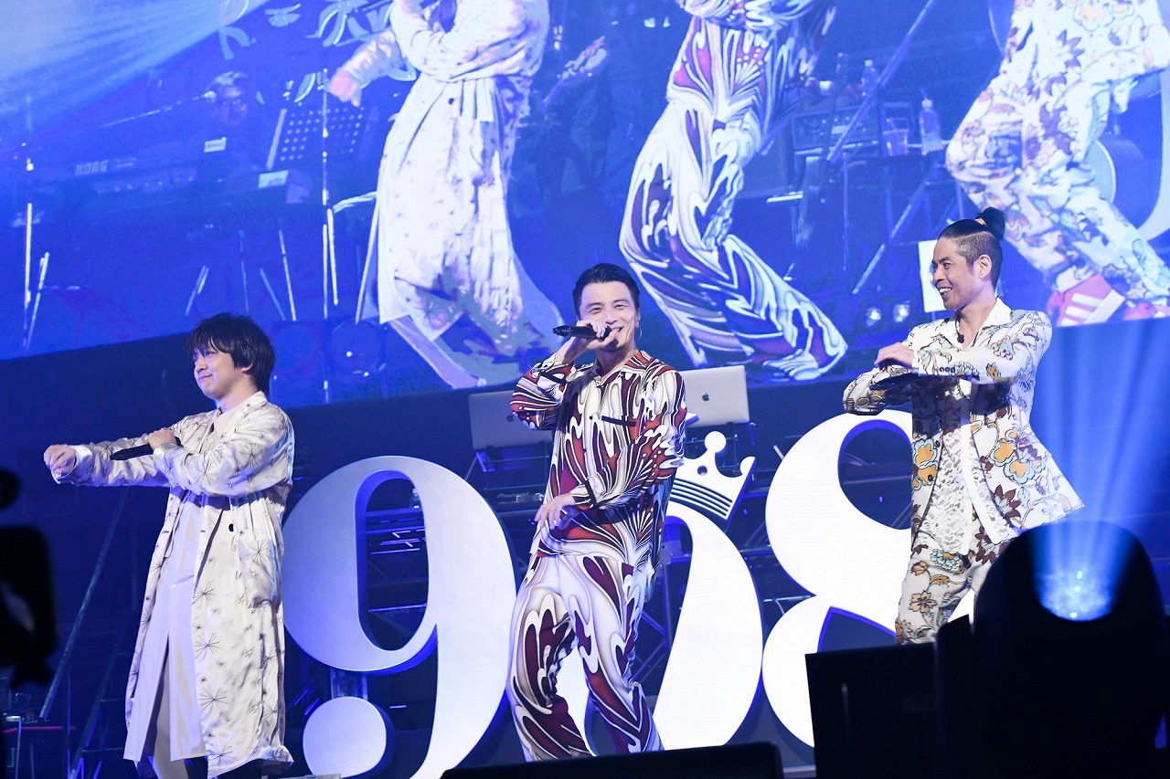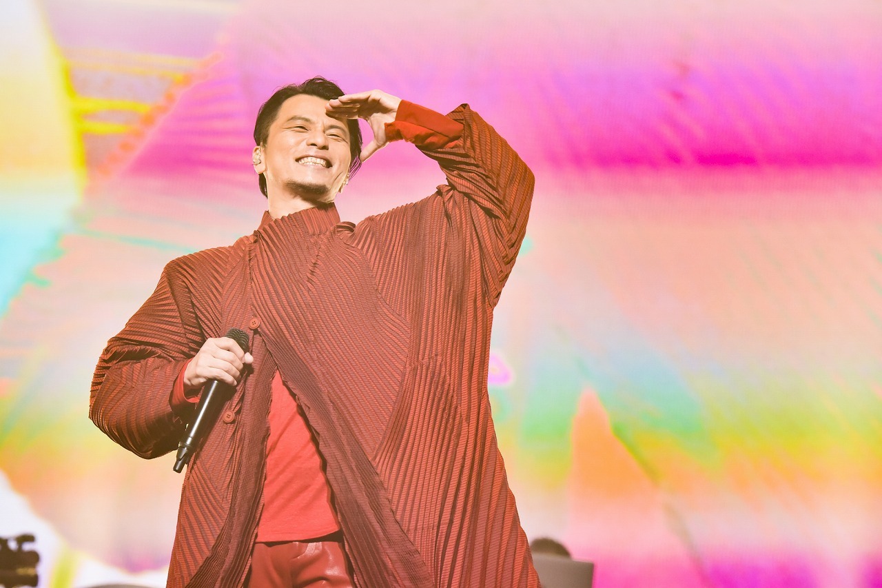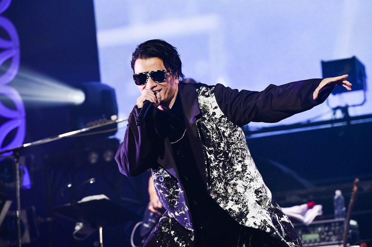 続いて、舞台に久保田利伸とKREVAが2人で現れると、さっきまでの歌謡ショーの雰囲気とはガラッと空気が変わり、ものすごいオーラがステージから立ち上がる。そうして「M☆A☆G☆I☆C」を歌い出すと、赤×シルバーのカラーテープが客席に向かって華やかに舞い、武道館がゴージャンスに輝きだす。そのなかで歌う久保田のソウルフルな歌声がまたきらびやかなのだ。軽やかなステップワーク、歌の語尾、“ハッ”と入れるブレス。もうその全部がグルーヴィーでファンキーな久保田。そんな久保田と対面すると、KREVAのパフォーマンスの熱量も一気にヒートアップ。そのKREVAが“アニキ”と慕う久保田は今年デビュー37周年。「アニキはファンキーもいいけどバラードの人」と熱弁した上で、代表作「Missing」を例にだすと「どんな曲だっけ?」とキーボードの柿崎を振り返り、その演奏になかった「Missing」を歌い出すという予定外のサプライズに、KREVAは驚きながらもすぐさまビートボックスを繰り出して対応。そして「これもいいんだけど、俺のなかでコード進行とメロディを思い浮かべるだけで、涙が出てくる曲の一つ」とKREVAが言って「これのヒップホップRemixじゃなくてオリジナルバージョンが聴きたい」と伝え、リクエストしたのは「Cymbals」だった。柿崎が弾いたフレーズに久保田がメロディをつけたことで誕生したというこの曲。イントロのエレピが鳴りだすと、場内はミラーボールが織りなす光が宝石のように輝きだし、久保田が歌う極上のバラードに武道館全体が聞き惚れる。そうして、最後は、久保田とSONOMIが凄まじいフェイク合戦で、場内を空気ごと震わせ、観客を最後まで魅了。