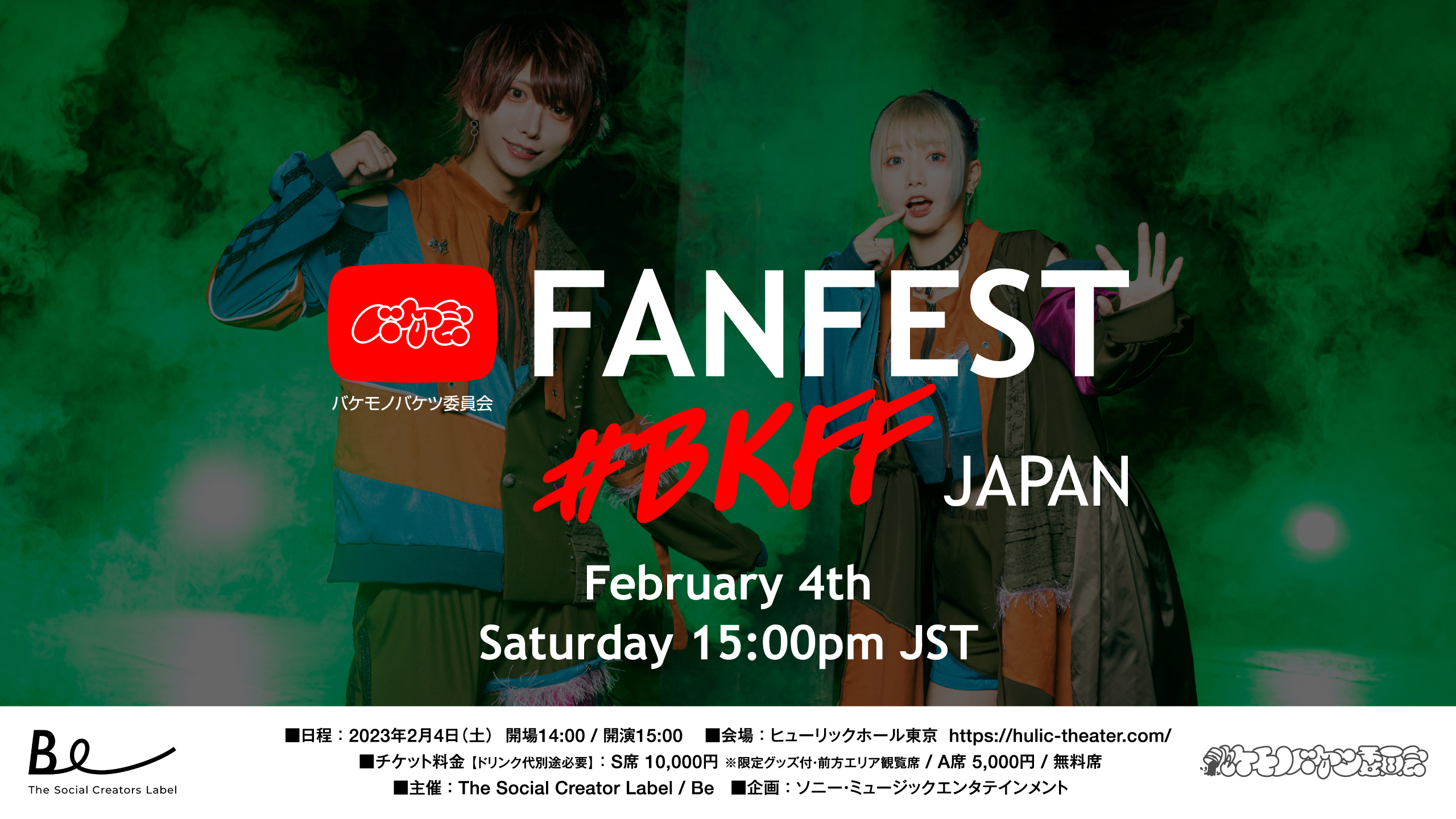 そんな2人のワンマンライブが、2023年2月4日(土)、ヒューリックホール東京にて開催されることが発表された。ライブタイトルは『バケ会 FANFEST #BKFF』。YouTube登録者20万人の達成を記念してのライブということで、ファンは大いに盛り上がれることだろう。本日・11月1日(火)20時よりオフィシャル先行受付がスタート。今回は、無料席も用意されているということでチケット販売ページをチェックしよう。