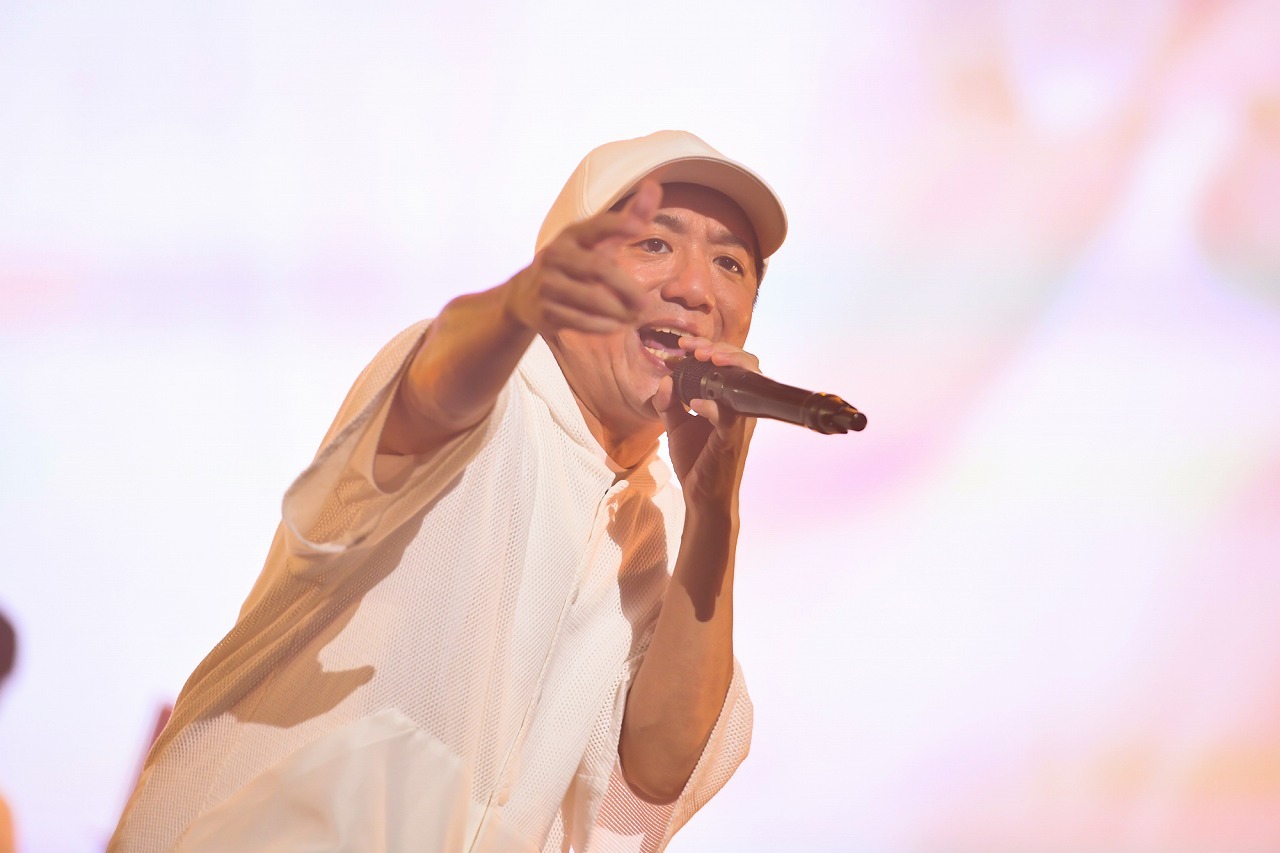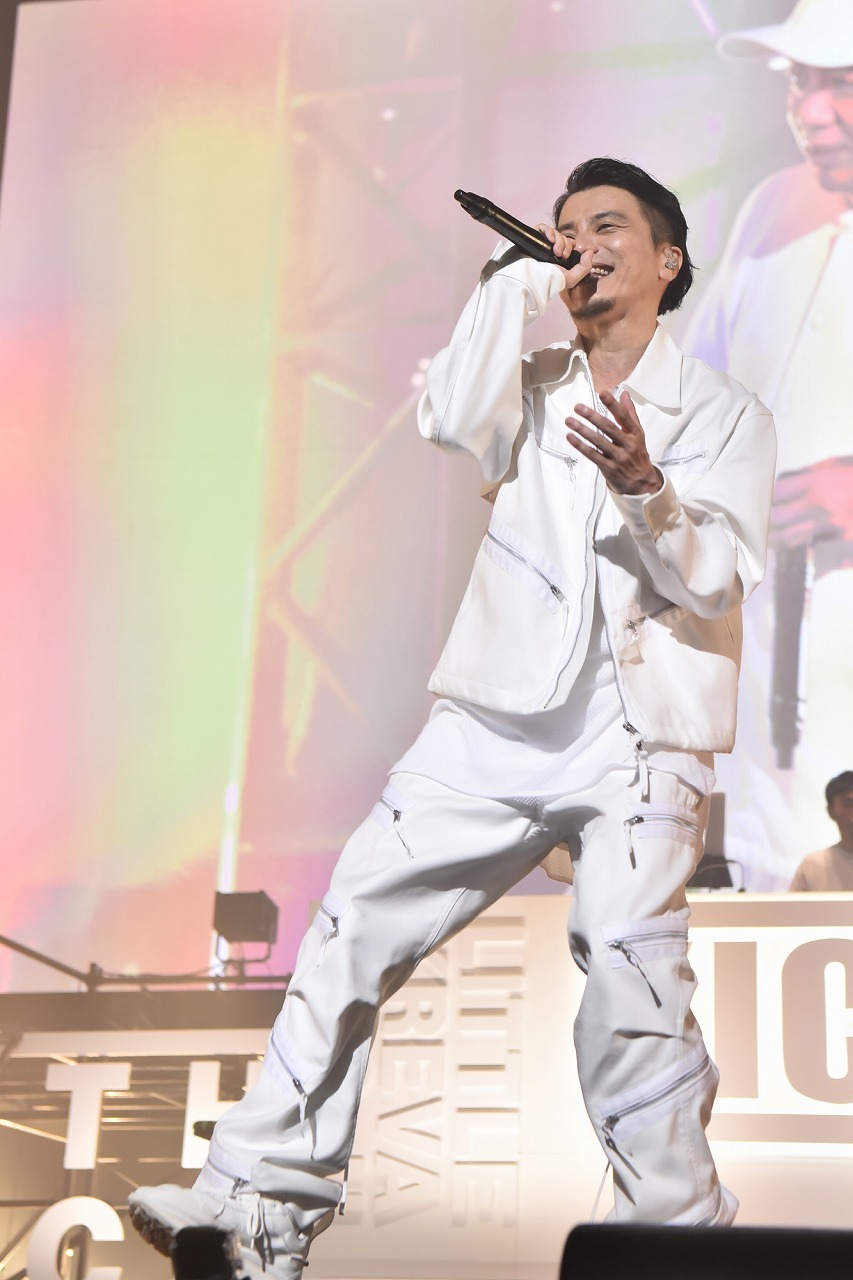 彼らが武道館で単独公演を行なうのはKICK復活後、2018年に行なった『KICK THE CAN CREW LIVE 2018「現地集合」』以来。スモークで真っ白になったステージ、客席に向けて7色のレーザービームが走るなか、ライブは《やあ 皆さまこんばんは 今から本番だ》というLITTLEの歌い出しから始まる最新アルバムのあの曲、「準備」で幕開け。キャスケットにハーパンのLITTLEに続いて、白黒の上に赤黒とチェックONチェック柄のシャツでキメたMCU、緑のジャケットにボトムも緑、髪のサイドにも緑のカラーを入れたKREVA。キャラもラップも三者三様のスタイルでマイクをつなぎ、2分足らずでウォームアップ完了。ステージとフロアの準備が整ったところで、さあここからは本番。ソウルグルーヴな「YEAH!アガってこうぜ」が始まると、とたんに3人のラップするスピードが高速に! 大量の言葉を超絶的な歌い回しで武道館に放っていく姿は超COOL!