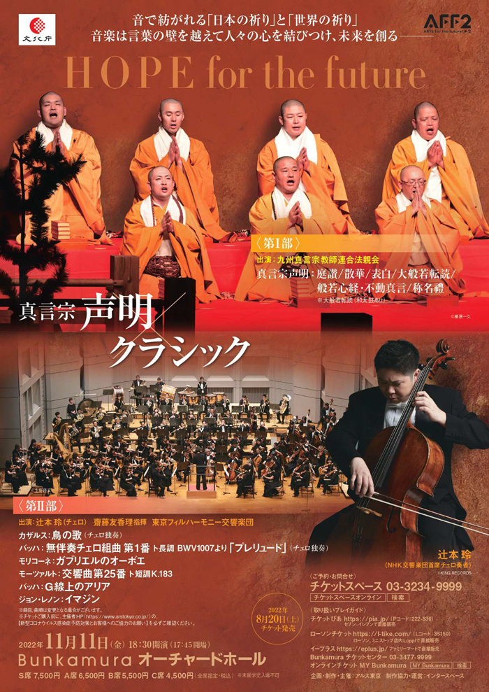 苦しいとき、辛いとき……古今東西を問わず、音楽はそっと聴く人の心を癒やしてきた。コロナ禍や不安定な世界情勢の中を生きる私たちにとって、音楽は明日を生きるための祈りでもある。来る11月11日(金)、Bunkamura オーチャードホールで「祈り」をテーマとした異色のコラボ・コンサート『<真言宗 声明>×<クラシック> HOPE for the future』が開催される。第一部は、荘厳かつダイナミックな<真言声明>を、第二部は辻本 玲(つじもと・れい)のチェロ独奏と共に東京フィルハーモニーとの共演で、クラシック音楽を聴く。「日本の祈り」と「世界の祈り」を一流の演奏で聞き、活力と癒しを得る貴重な機会になりそうだ。混沌とした現代社会にあって、人の心を励まし、世界平和を願う音楽の力を改めて信じたい。今回の異色コンサートに向けた想いを、出演する堤導師と辻本氏に聞いた。