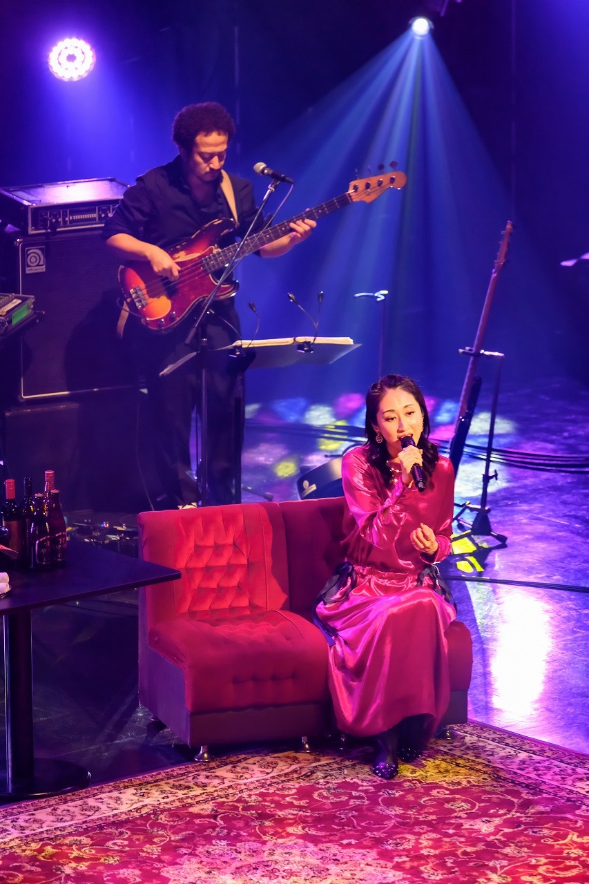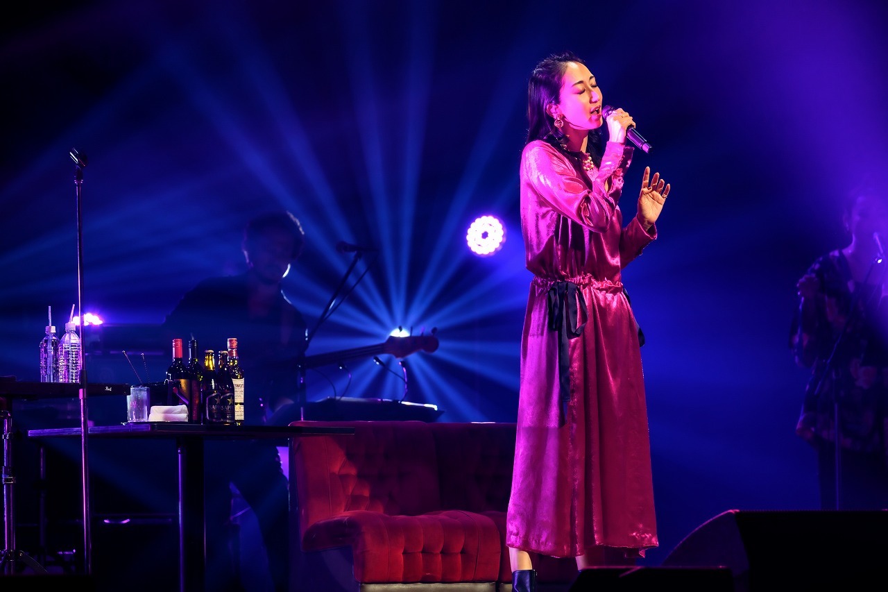 およそ10分間の休憩を経て始まった第二部は、『流しのOOJA 2~VINTAGE SONG COVERS~』を、曲順通りに全曲披露する特別企画だ。髪をほどいて鮮やかなワインレッドのロングドレスに着替えたOOJAが、ミラーボールの下で荻野目洋子「六本木純情派」と竹内まりや「プラスティック・ラブ」を歌う。80年代アイドルポップとシティポップ、スタイルの違いを超えて歌に同化する、まさに“流し”の貫禄たっぷりの見事な表現力。