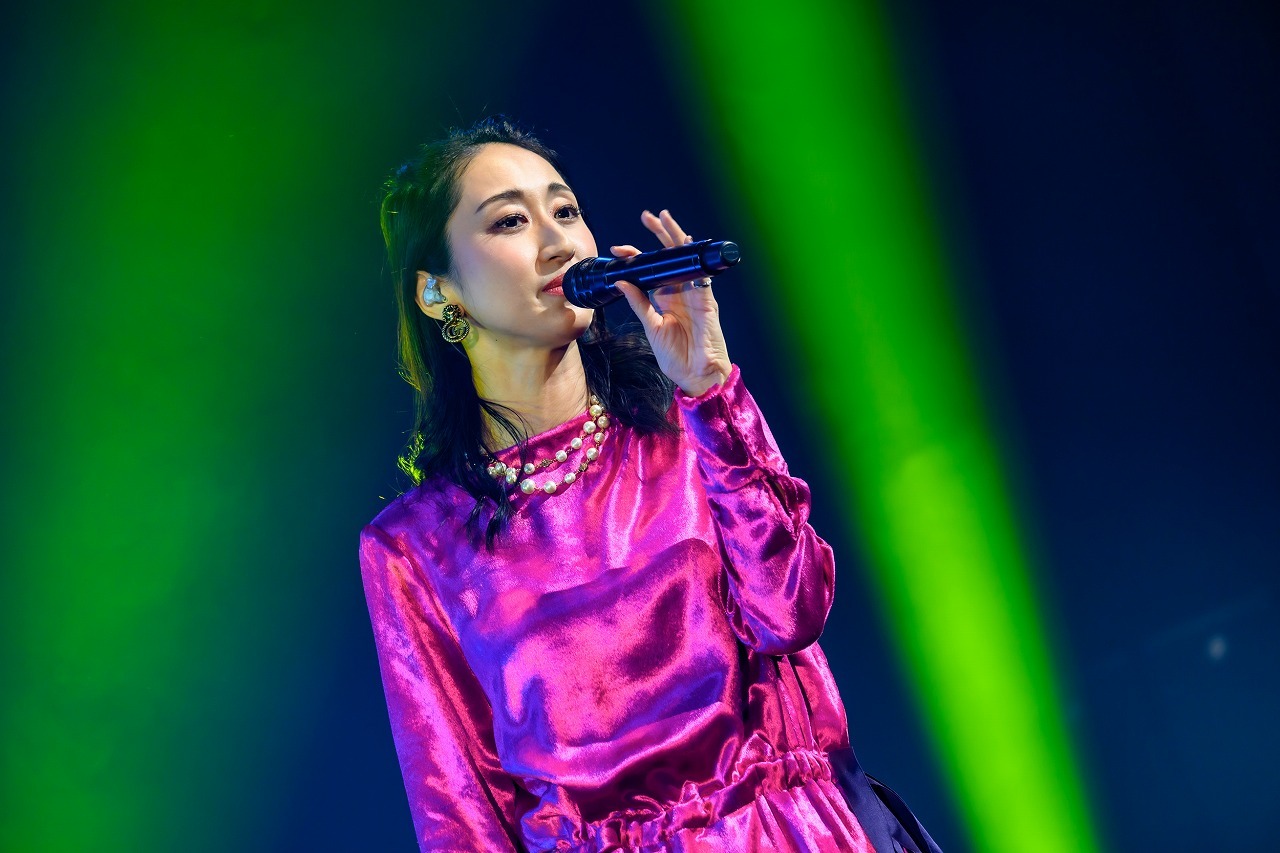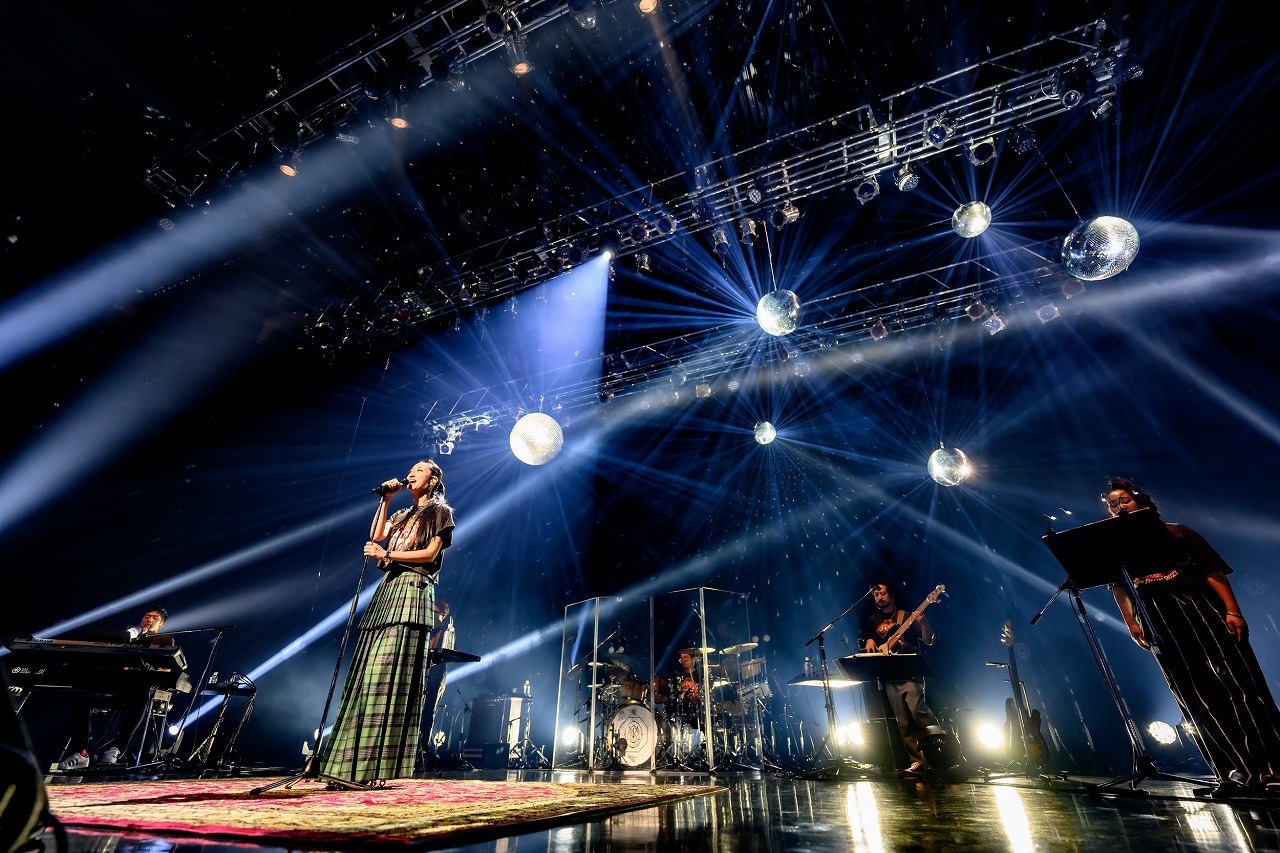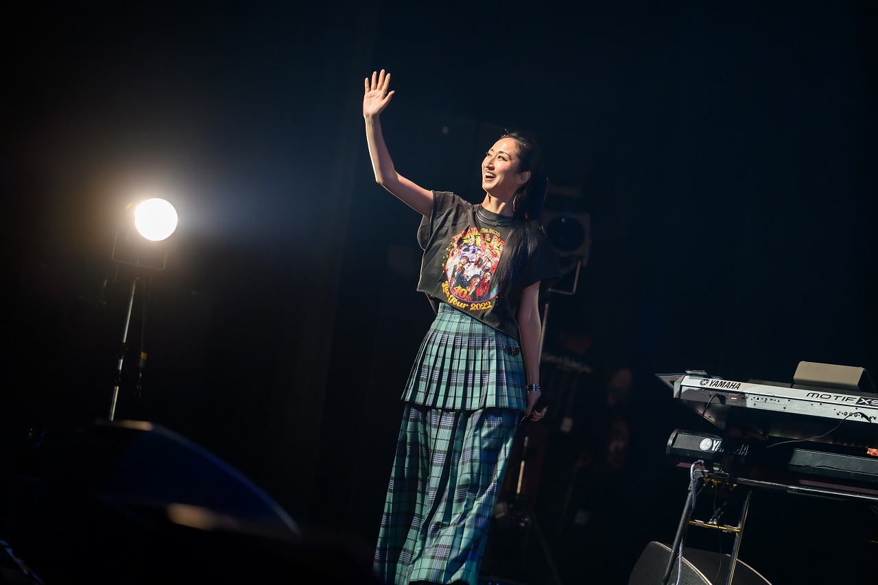 ツアーTシャツにグリーンのロングスカート、長い髪をポニーテールに結んだナチュラルな出で立ちで、手を振りながらステージに現れた瞬間から満面の笑みが隠せない。明るい華やぎの中、4ピースのバンドと2人のコーラスが奏でる力強いグルーヴをバックに、11年前のデビュー曲「It's OK」、そして「JEWEL」と、懐かしめの楽曲を連ねてオーディエンスの心をぎゅっとつかむ。フロアは着席スタイルだが全員がクラップと手振りに参加して曲を盛り上げ、いくつものペンライトがにぎやかに振られる。ほかのライブとはちょっと違う、バースデーライブにしかない独特のあたたかい祝福ムードが楽しい。