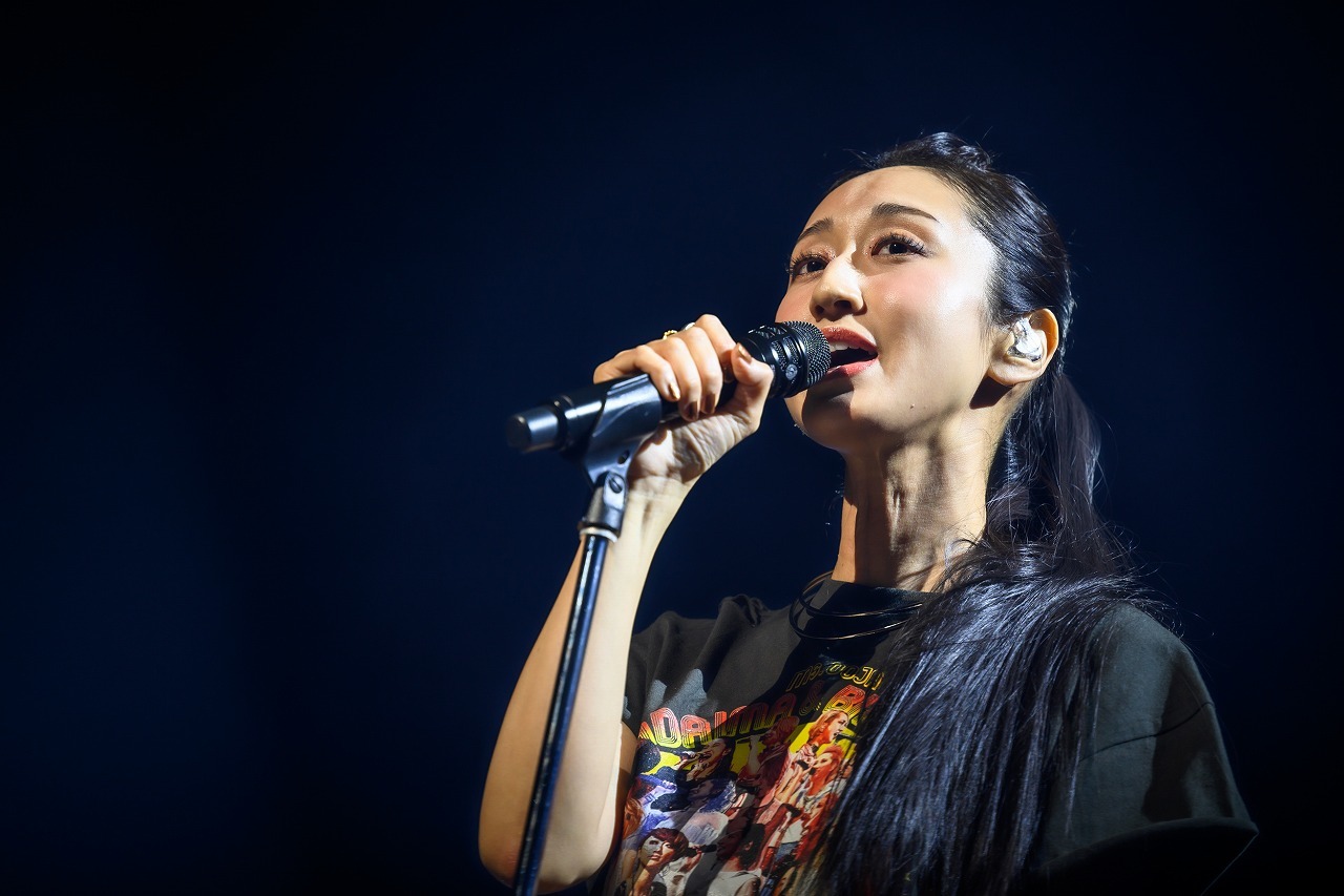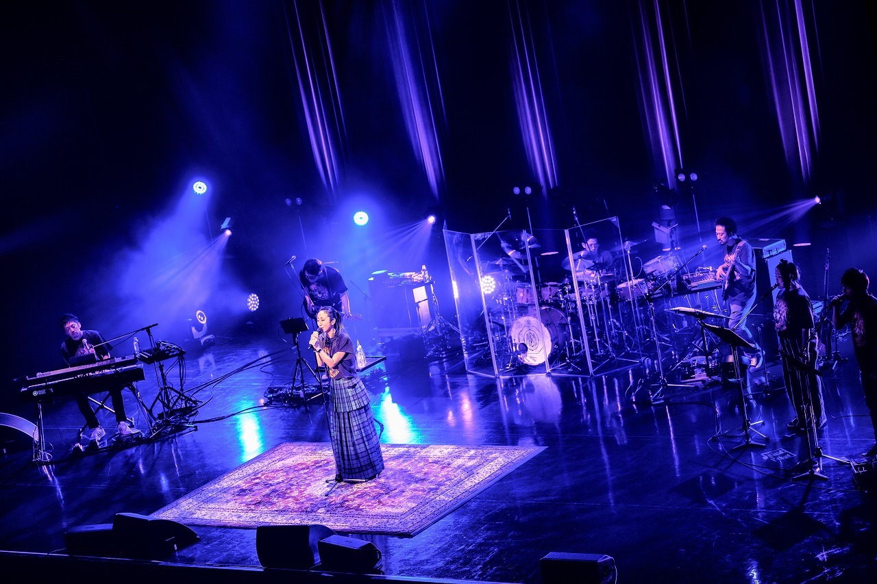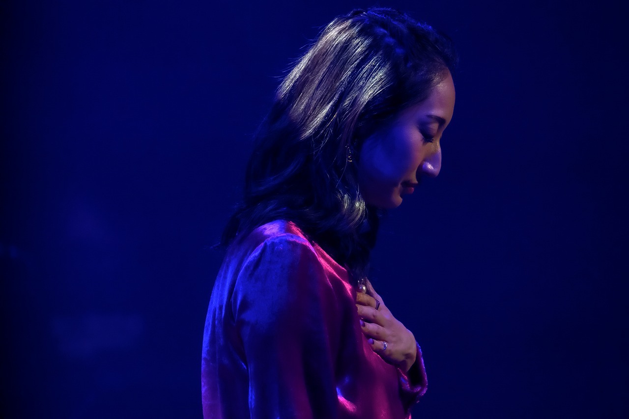 ツアーTシャツにグリーンのロングスカート、長い髪をポニーテールに結んだナチュラルな出で立ちで、手を振りながらステージに現れた瞬間から満面の笑みが隠せない。明るい華やぎの中、4ピースのバンドと2人のコーラスが奏でる力強いグルーヴをバックに、11年前のデビュー曲「It's OK」、そして「JEWEL」と、懐かしめの楽曲を連ねてオーディエンスの心をぎゅっとつかむ。フロアは着席スタイルだが全員がクラップと手振りに参加して曲を盛り上げ、いくつものペンライトがにぎやかに振られる。ほかのライブとはちょっと違う、バースデーライブにしかない独特のあたたかい祝福ムードが楽しい。