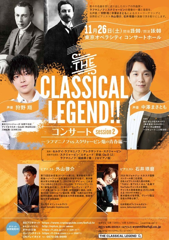 そして、先頃「session2 ラフマニノフvsスクリャービン 焔の青春編」の開催が発表に。ピアニストには、初回に続く石井琢磨と、新たに外山啓介が出演。さらに声優陣は狩野翔、中澤まさともが出演し、ラフマニノフ(中澤)とスクリャービン(狩野)に扮する。今回初参加となる声優ふたりに話を聞いた。