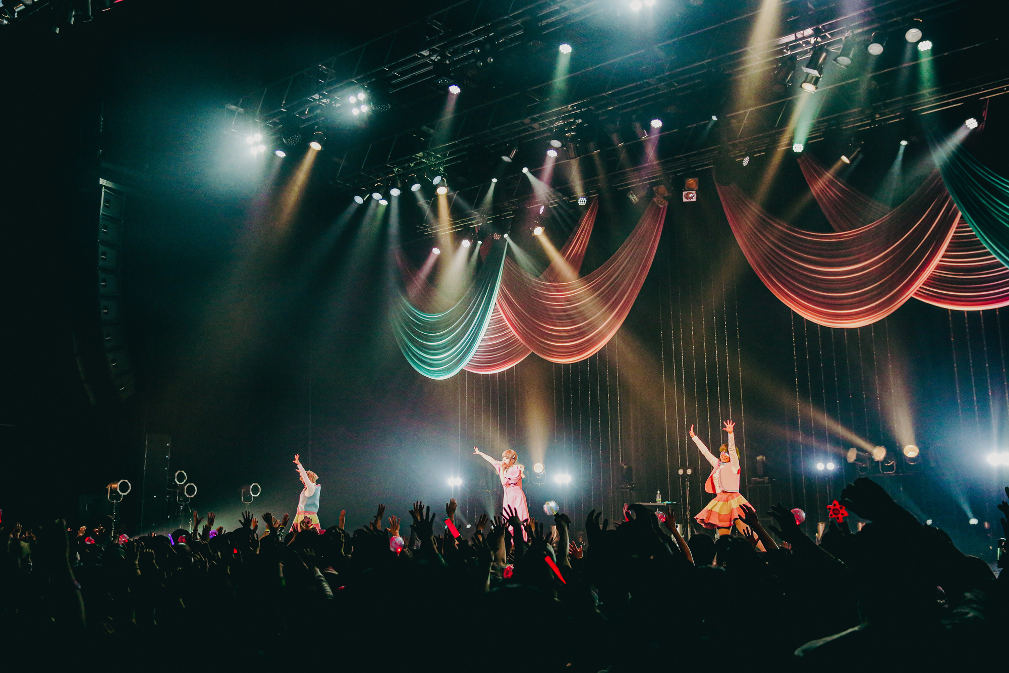 ステージにはピンクとブルーの大きな布が掛けられ、メルヘンな雰囲気を醸し出す。定刻になり、MCをつとめるFM大阪のDJ 赤松悠実が登場。「Zepp Nambaにようこそー! ほんでライブできる時代、最高ー!」とオーディエンスを歓迎し、1組目のきゃりーぱみゅぱみゅを呼び込みライブがスタート。