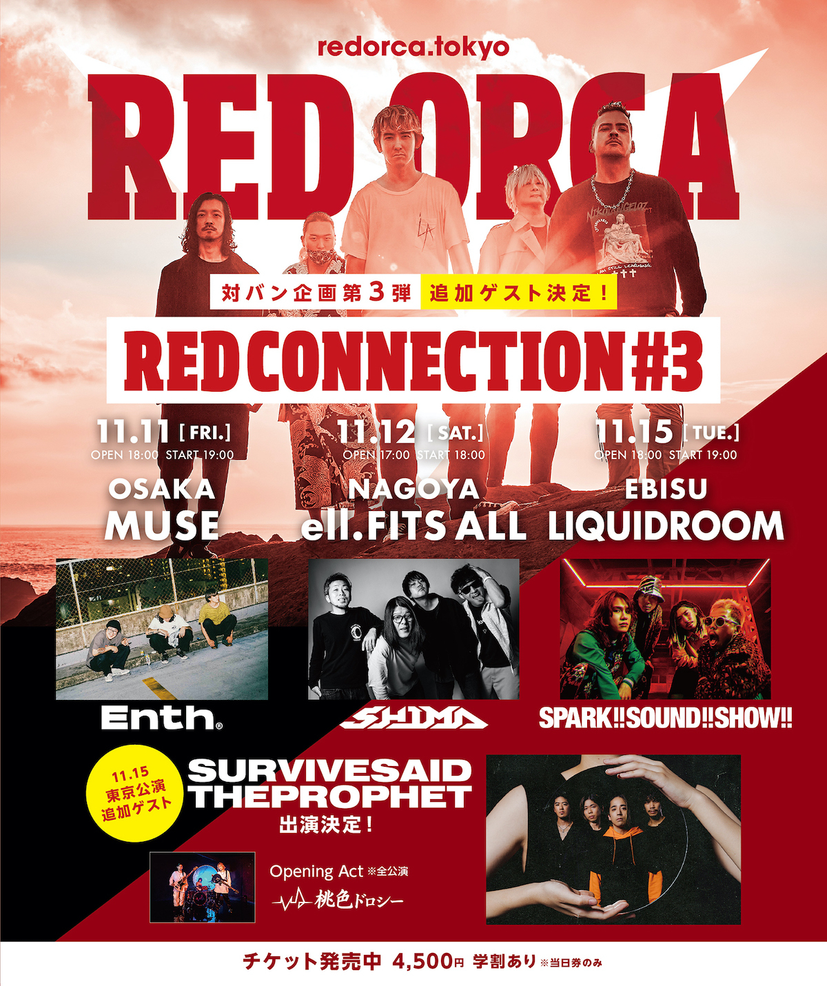 今回の新曲リリースを受け、11月11には『RED CONNECTION #3』と銘打たれた東名阪ツアーも実施される。対バン形式によるこのツアーも今回でシリーズ第3弾となるが、第1弾の際にはスケボーキング、山嵐との共演をはじめ、Dragon AshのKjのサプライズ出演も話題を呼び、第2弾ではPaledusk、Age Factory、Newspeakといった錚々たる顔ぶれとステージを共にしてきた。今回もENTH(大阪)、SHIMA(名古屋)、SPARK!!SHOUD!!SHOW!!(東京)といった勢いのあるバンドたちが顔を揃え、さらに東京公演にはSurvive Said The Prophetの追加出演も決定している。