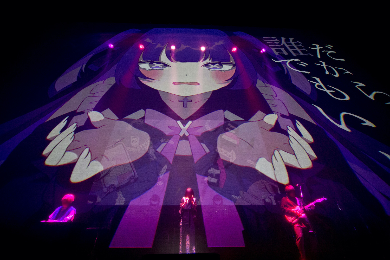 この日のライブは、ミュージックビデオをステージ背面に映し出しながら、本編ではMCを一切挟まずに曲を畳み掛けていく構成になっていた。「雨模様」では、瑞々しくもどこか寂しげで儚い空気でフロアを包み込むと、「ルーザーガール」では、ぷすがときに軽やかに、ときに激しくギターをかき鳴らす。また、真っ赤な照明に包まれる中、miroが激情的に鍵盤を叩き上げるダークなインスト曲「強欲」から「デモーニッシュ」へ。複雑な曲展開を繰り広げる中、〈ちょうだいな ちょうだいな〉と童歌風のキャッチーなフックを織り込みながらも、乱高下&超高速で突き進むメロディを歌いこなしていく礼衣の歌唱力は、とにかく圧巻。ツアーを通して磨き、鍛え上げてきたスキルやアンサンブルが、綴られている歌詞であり、メッセージをより強烈なものにさせていた。