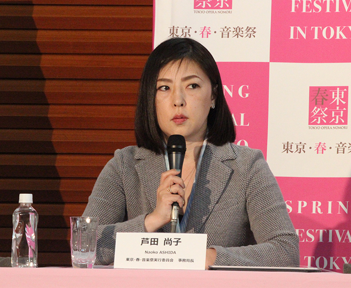 続いて芦田事務局長がラインナップについて説明。3月18日の開幕公演には、2年振りの開催となるリッカルド・ムーティ「イタリア・オペラ・アカデミー in 東京」でヴェルディ『仮面舞踏会』を上演。受講生を募集したところ世界24か国から約100名(うち日本人約25名)の応募があり、この後5人に絞られるという。このシリーズはマエストロ・ムーティの意向もあり、今後も続けていく予定であるという。
