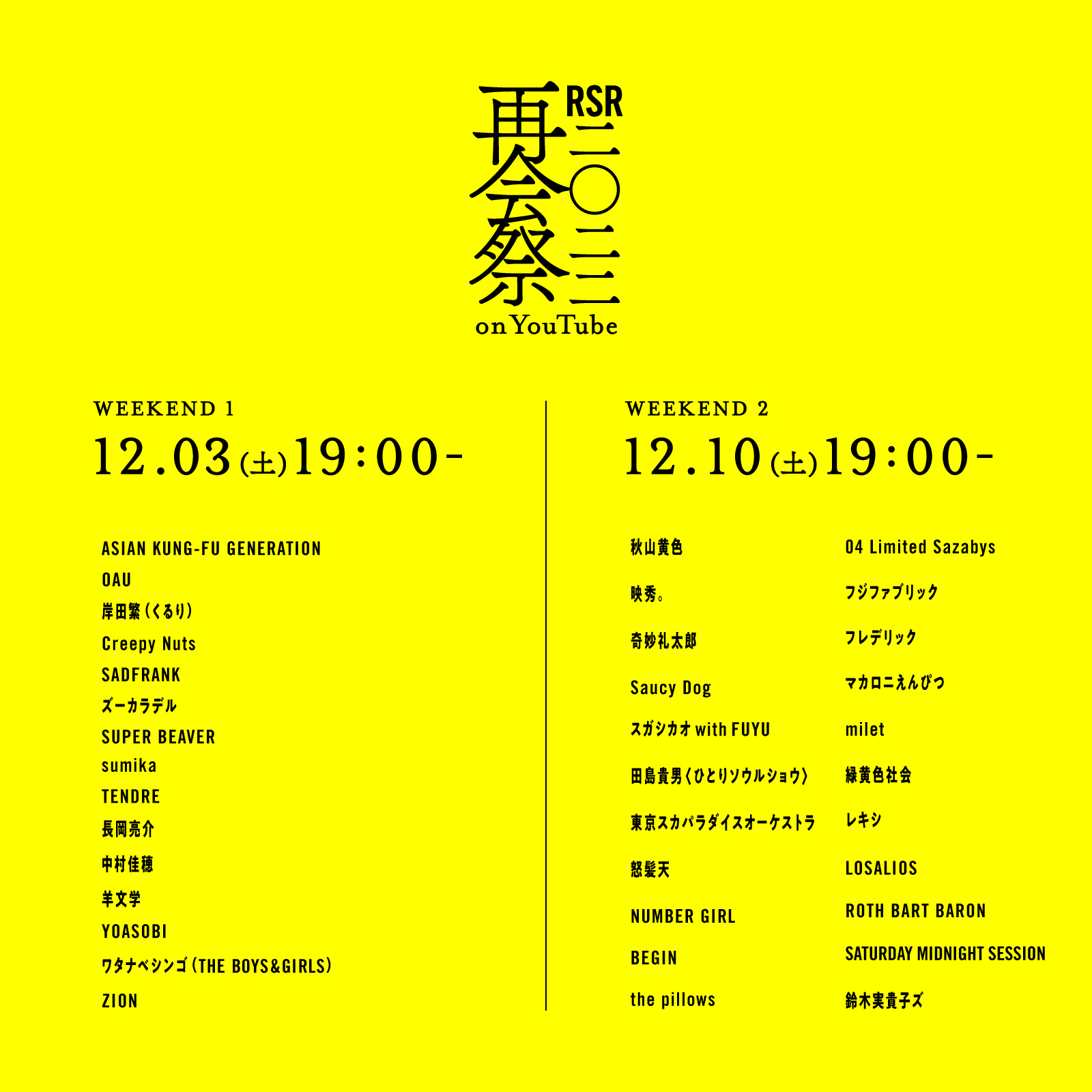 奥田民生、岸田繁(くるり)、渋谷龍太(SUPER BEAVER)、TOSHI-LOW(BRAHMAN/OAU)らが参加したセッションステージ「SATURDAY MIDNIGHT SESSION」をはじめ、この日のステージで解散を発表したNUMBER GIRL、夜明けを共に迎えたクロージング・アクトのBEGINら全37アーティスト全68曲のライブ映像に加え、アーティストインタビュー、来場者の再会エピソード、スタッフのこぼれ話も配信される。