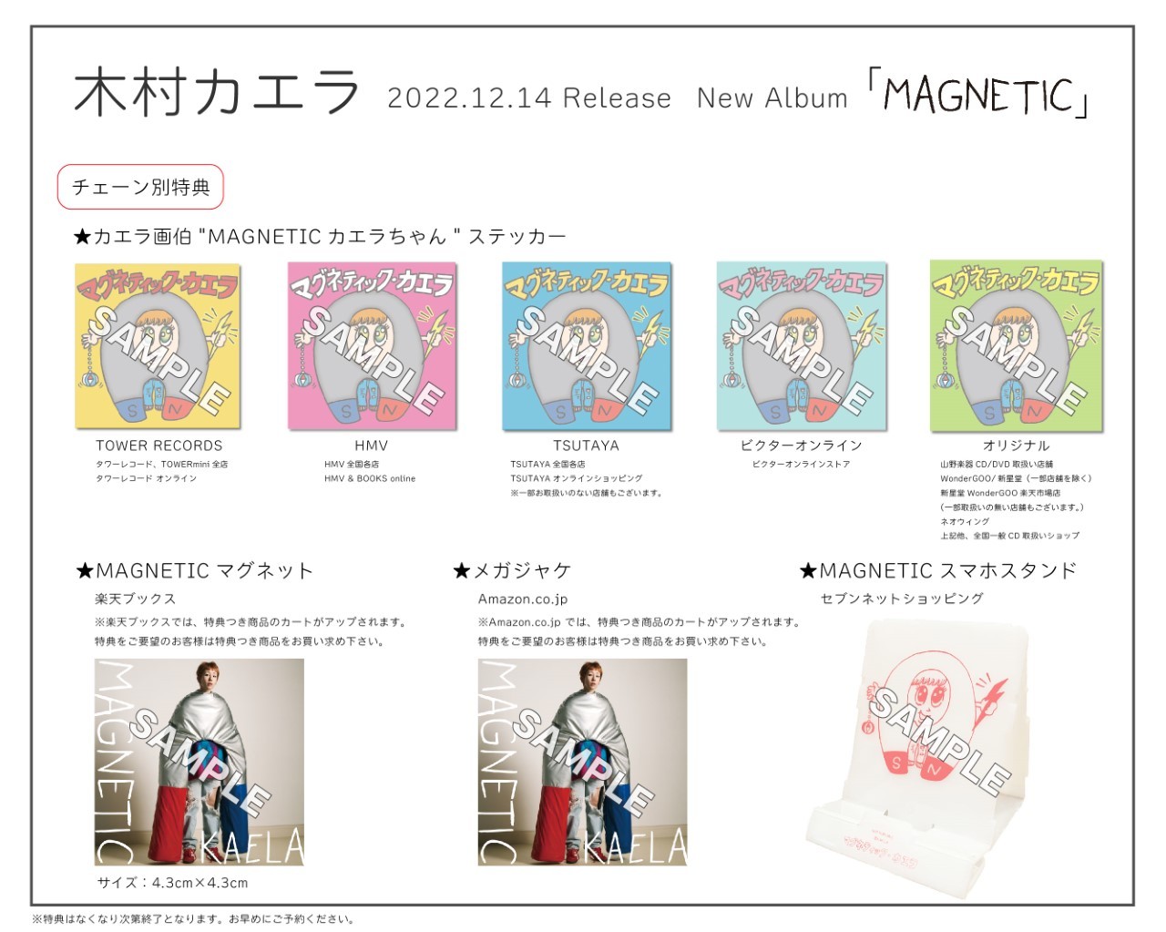 併せて公開された各種特典画像は、ジャケット写真を使用したものから木村カエラによる描き下ろしイラストのものまで、貴重な特典となっている。「MAGNETICマルチクリアファイル」がもらえる早期予約特典の受付は11月14日(月)18:00までとなっている。