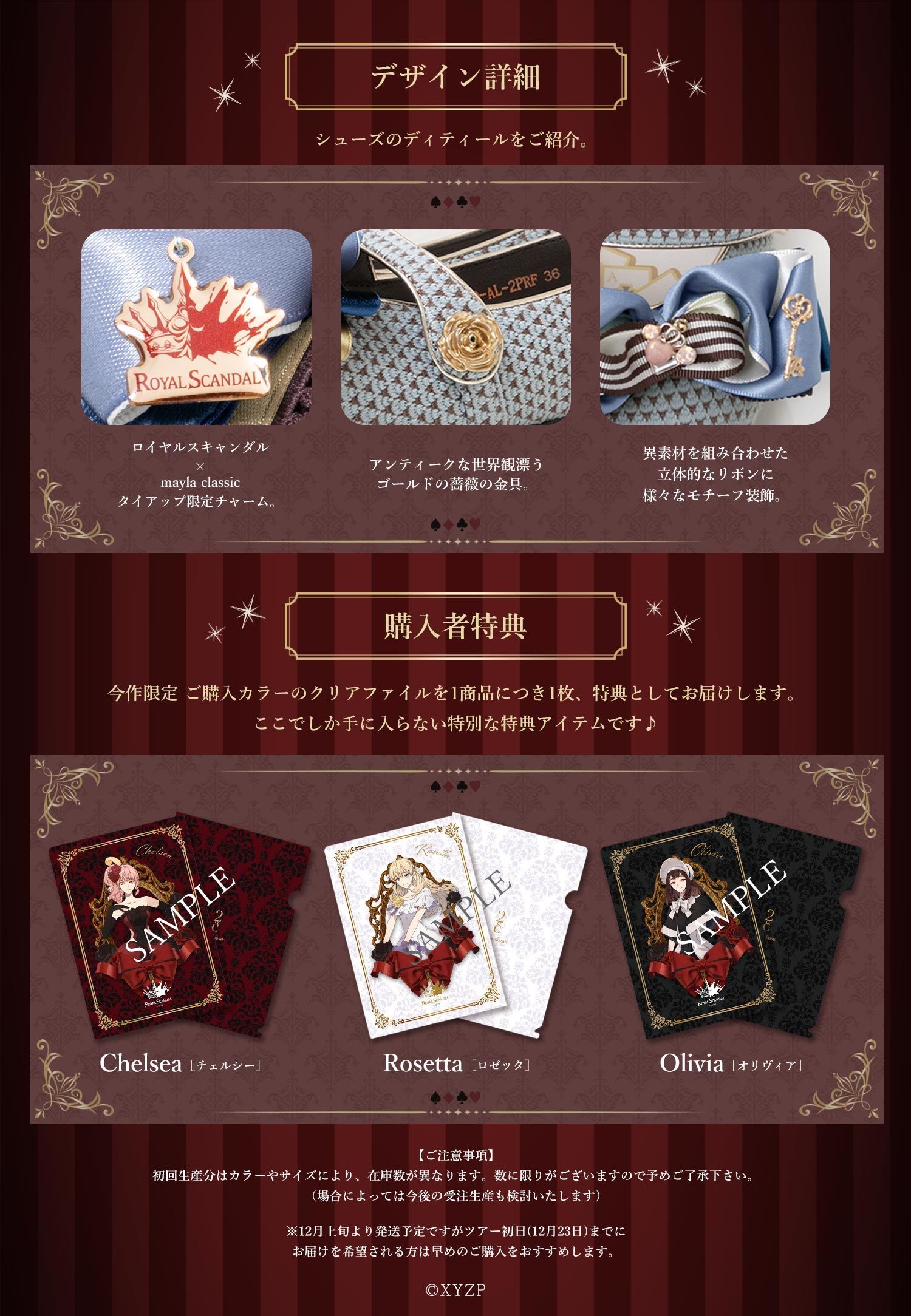 今回発売される商品は、ロイスキャのキャラクター「チェルシー」「ロゼッタ」「オリヴィア」をモチーフにした幻想的なデザインのパンプスとなる。3カラーでの展開となり、ロイスキャのロゴがデザインされたチャームが付く形で発売される。さらに、購入したカラーのキャラクタークリアファイルが購入者特典として付いてくる。発売開始は11月11日(金)20時からで、数量限定での販売となるとのこと。