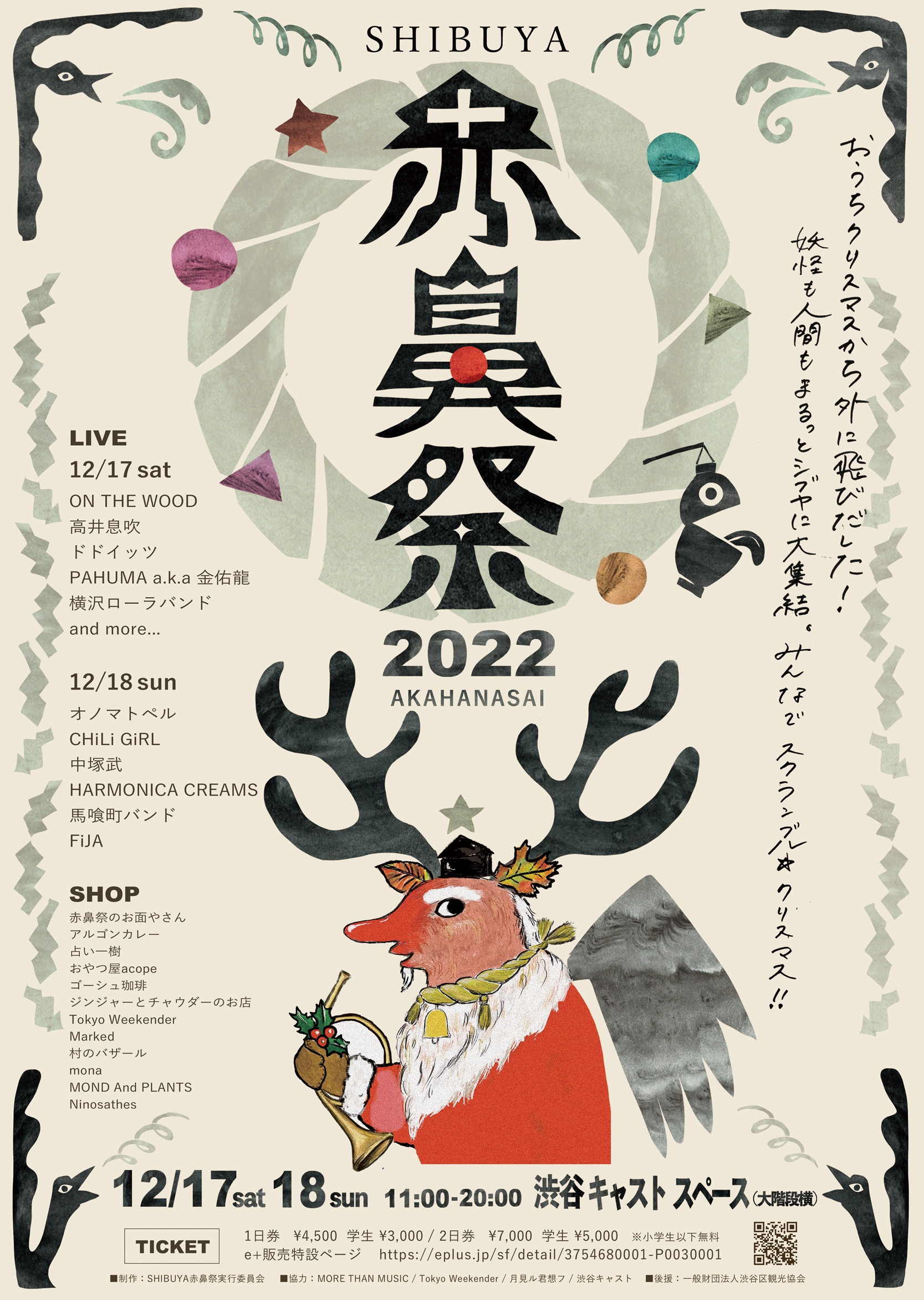 自由なクリスマスをテーマに集まった気鋭のアーティスト・バンド12組によるライブ、フードにドリンク、そのほか多種多様なマーケットと共に不思議な世界に誘う。新たな“シブヤワールド”をヘンテコな仲間たちと一緒に発見しよう。チケットはe+特設サイトにて販売中。1日券(一般4,500円/学生3,000円)のほか、お得な2日券(一般7,000円/学生5,000円)も数量限定販売。小学生以下は無料。