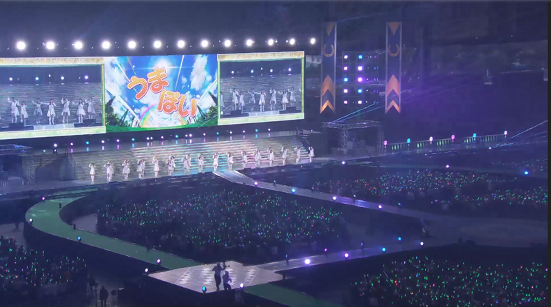 そんなオグリキャップのメッセージとウマ娘ブラスバンドの生演奏と共に、本日二度目にしてフィナーレを飾る「うまぴょい伝説」がスタート。明坂聡美と井上喜久子も加わって、トラックコースやランウェイを走りながらファンの近くで声援に応えながら全員で「うまぴょい伝説」を熱唱しこの日最高とも言える盛り上がりを見せた。