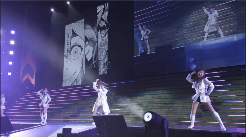ゆったりとした前曲から一転して、エレクトリックなビートと妖艶な雰囲気のピンク系のライティングが場内を包み込み、そのメロディとステージに現れたメンバーの姿に場内も一気に沸き上がる。始まった曲はゲーム開始1.5周年の記念曲でライブ初披露となる「Gaze on Me!」。初出演メンバーがメインで、しかもDAY1出演陣からオリジナルメンバーが総登場というファンには嬉しいステージとなった。