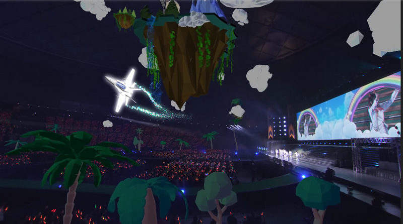 配信では会場内に浮遊大陸やジャングルが出現し、その合間を縫って飛ぶジェット機のように星谷とダンサーも両腕を翼のように広げてセントラルステージへとダッシュ! マヤノの元気そのままに初のソロステージを見事飛びきってみせた。