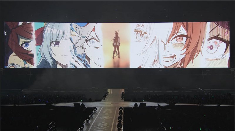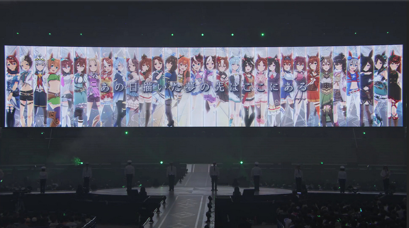 スペシャルウィークとオグリキャップのモノローグに乗せて、メインステージの大型ワイドスクリーンにはゲーム中の名シーンやウマ娘達の激走、本日出演する総勢30名のウマ娘が流れ、最後にライブ開始を告げる「出走」の文字が大きく映し出された。