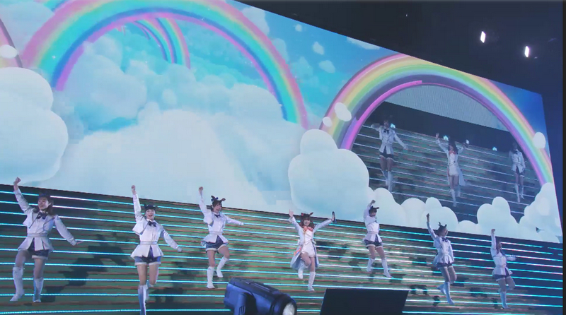 間奏ではゲーム中では思い悩んで走るのを諦めようとしたライスシャワーがこのステージに立てた喜びを笑顔で表し、それをタイキシャトルが受け止めるというファンにはたまらない掛け合いや、全員でジャンプを決めるゲーム内ライブの見せ場も再現しながら仲間やライバルとの絆を唄い上げ、ゲームとリアルを繋ぐような嬉しさ・楽しさに満ちたステージとなった。