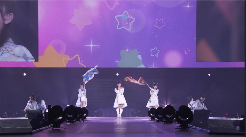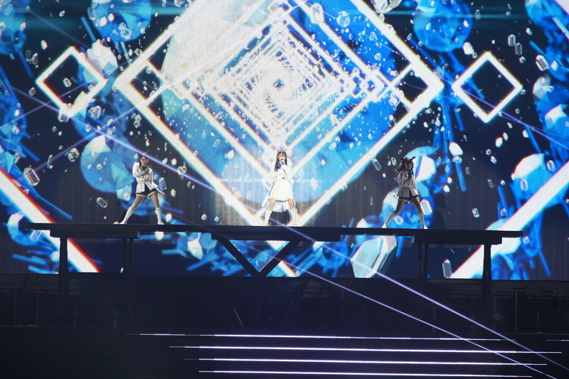 花が舞うような華麗さと勝利を目指す情念が溶け合うトリプルティアラの世界を描いたナンバーを、メインステージでダンサーを従えた四人は可憐かつ情熱的な歌声とパフォーマンスで紡ぎ出していく。