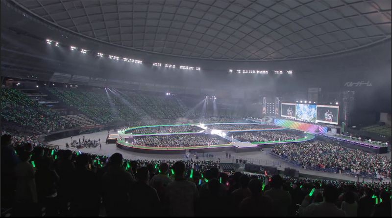 開場時間を迎えて、ドーム内に入った大多数のファンを驚かせたのが今回のステージ。バックスクリーンのメインステージからアリーナ中央に向けて伸びたランウェイは、アリーナ中央のセンターステージから十字に広がり計5つのステージを繋ぐ。さらにアリーナ席を取り囲むように設けられたのは、2ndイベント以来となる芝生のような緑に染まった競馬場のコースを模したトラックステージ……そう、ゲーム内でおなじみの『うまぴょい伝説』ライブステージがリアルで再現されているのだ。ドーム公演ならではの広さをフルに活かしたステージで、どんなリアル「ウイニングライブ」が繰り広げられるのか? そんな期待でファンのボルテージが静かに上がっていく中、いよいよ開演の時が近づいていく。