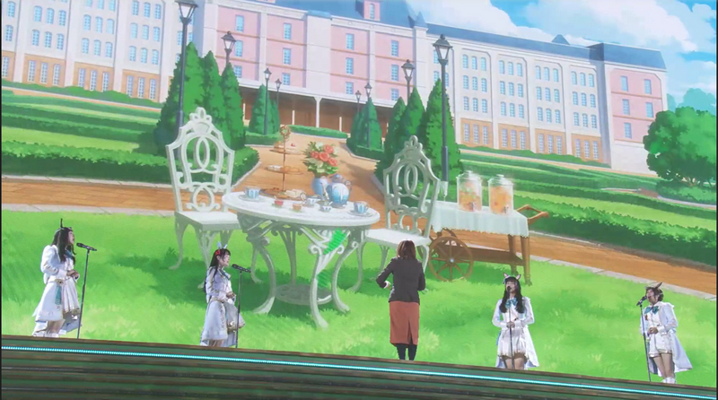 トリプルティアラを舞台に花咲く優雅なステージをお楽しみ下さいという明坂聡美の実況と共にスタートしたのは、中央競馬の牝馬三冠レースをモチーフにした「トリプルティアラ」を勝利したウマ娘のための歌「彩 Phantasia」。唄うのは井上ほの花(アストンマーチャン役)、久保田ひかり(メジロドーベル役)、木村千咲(ダイワスカーレット役)、礒部花凜(ダイイチルビー役)ら、ゲーム中のトリプルティアラで熱い戦いを繰り広げるウマ娘を演じる面々だ。