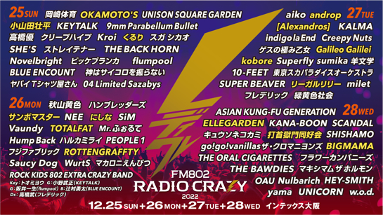 3年ぶりにインテックス大阪での開催が決定した、FM802が毎年年末に開催するロック大忘年会『FM802 RADIO CRAZY』。今年は初の4日間(12月25日~28日)開催となる同イベントのメインステージの全出演者が発表された。