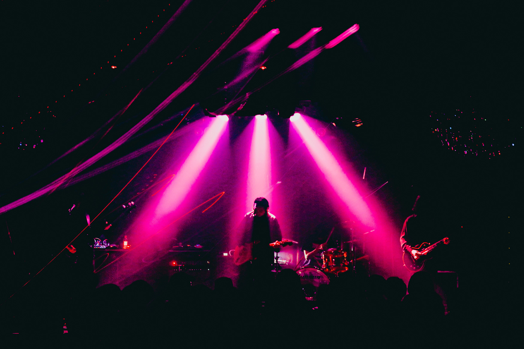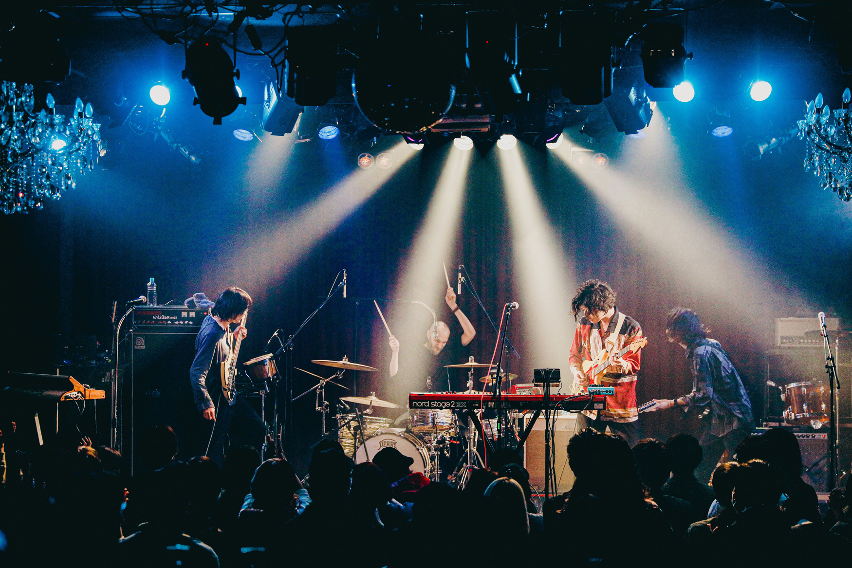 ミドルテンポの楽曲のあとに続くのは「Rainbow」。吉木諒祐(Dr)が描く複雑だけど爆発力のあるビートがバンドの音を引っ張っていく。小林祐介(Vo.Gt)が叫びを上げ、高松浩史(Ba)が生み出す轟音のリズムが鳴り響くけれど、核を優しく包み込んでいくような、不思議な安心感を覚えてしまう。緻密に作り込まれた音は繊細で美しく、観客はただじっと立ち尽くすように音に浸っている。2007年に発表された、バンド初期曲「アマレット」では耽美な詞世界を2022年、今のバンドの音で再現。彼らがライブでよく言葉に出す「未来」という言葉を具現化したサウンドは楽曲に新たな解釈を生み出しているようで、言葉のひとつひとつがより甘美に耳に残る。