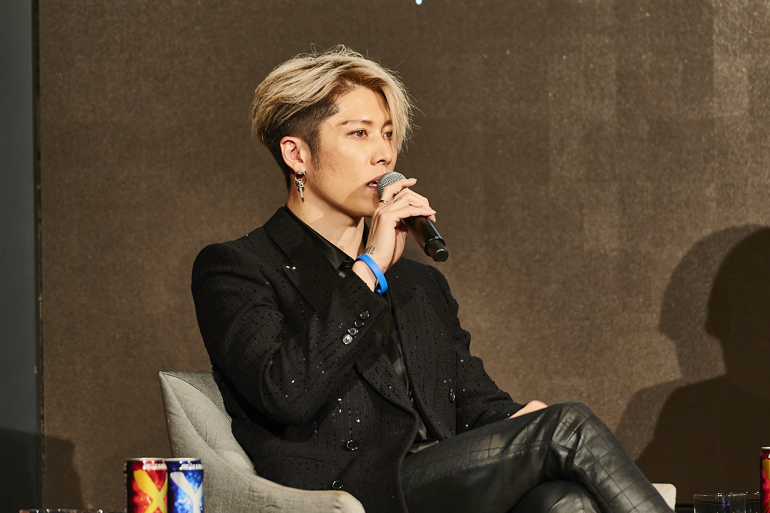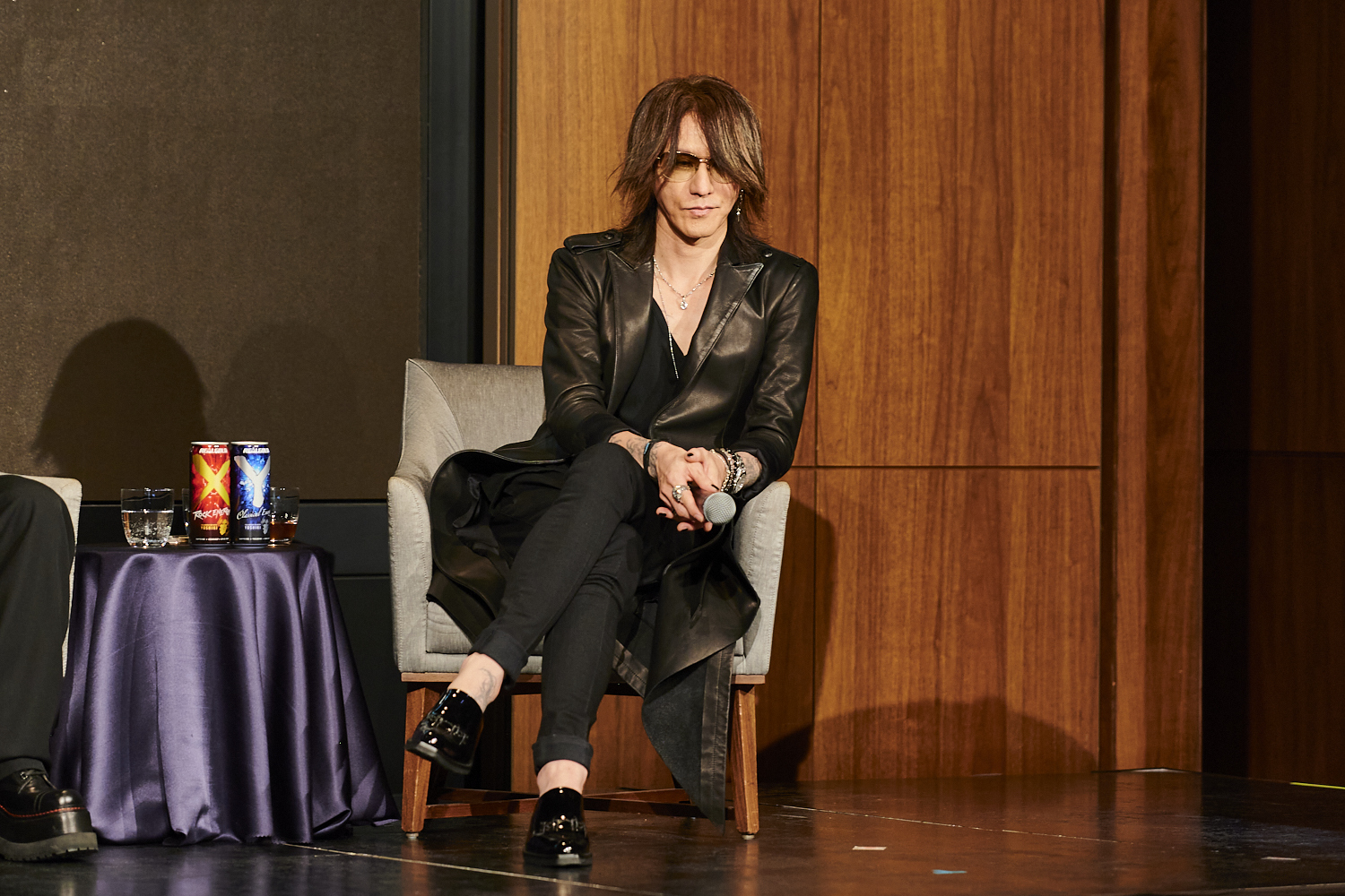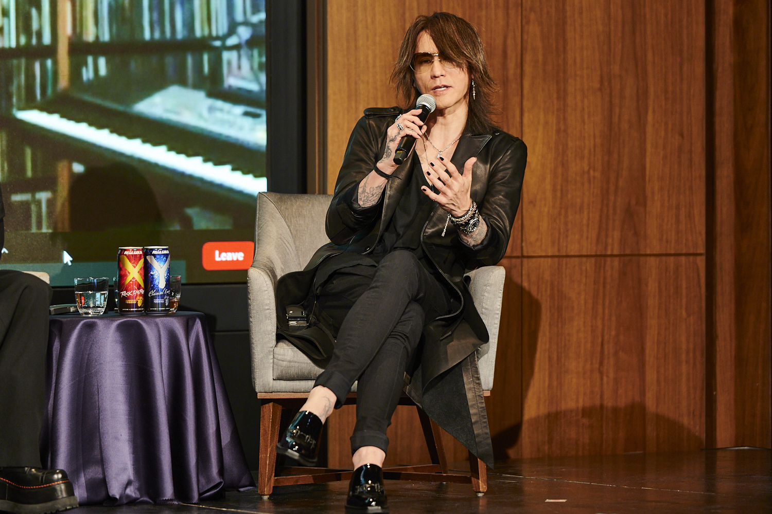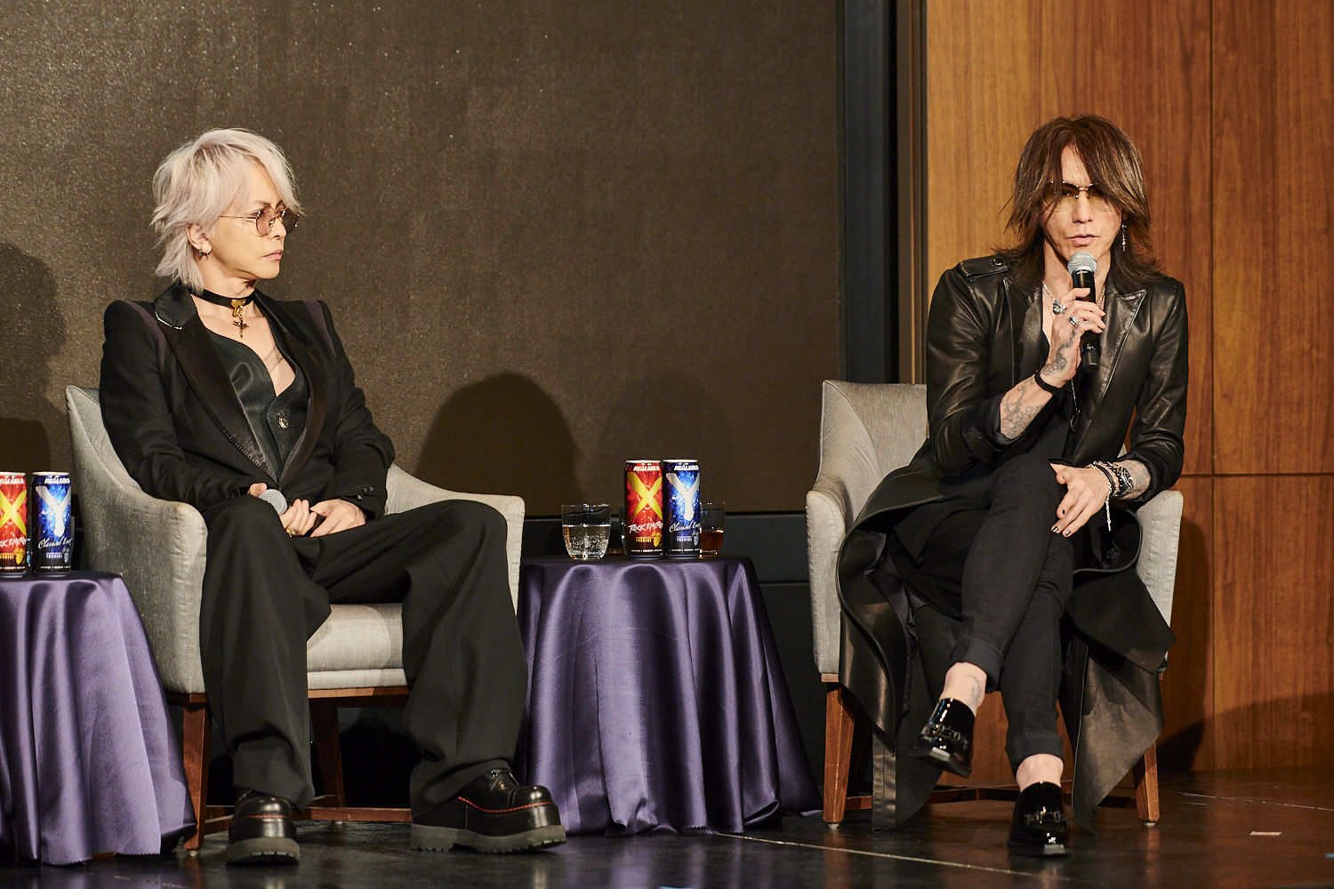 この後、4人はステージ上に用意された椅子に着席。左右に置かれていたドリンク(YOSHIKIとのコラボで誕生したREAL GOLD X/Y)を前に「僕はどっちを飲めばいいの?」と子供のような質問をするYOSHIKIに、目線でこっちだよと合図をおくるHYDE。超ビッグスターとは思えないなんとも愛らしい姿に、思わずほっこり。