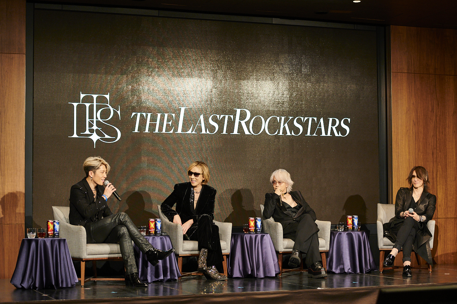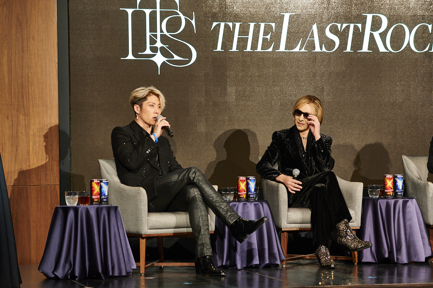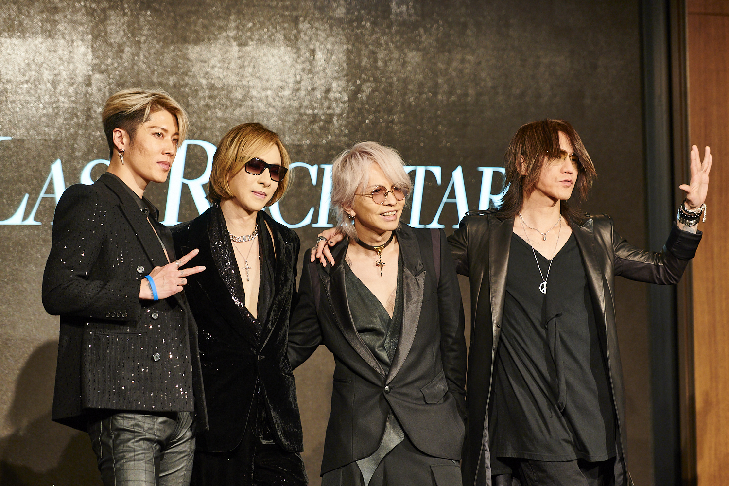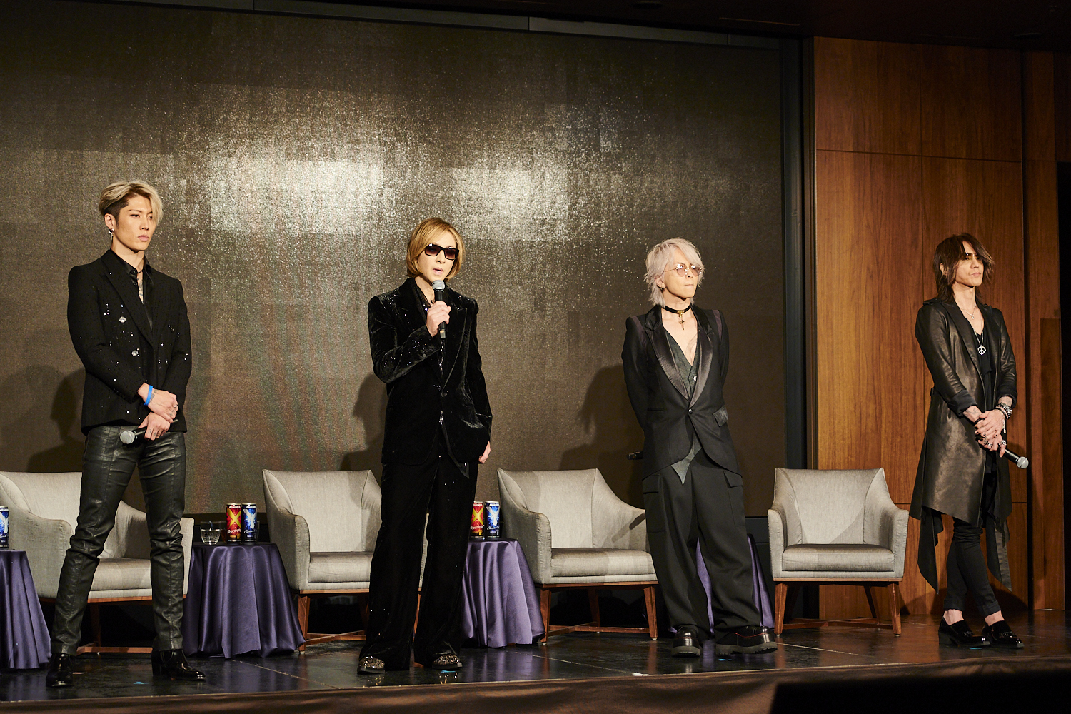 胸元のタトゥーをチラチラ見せながら、HYDEは「やっとこの日が来た……もしくは、来てしまった」と言ってメンバーを笑わせた後、「僕もドキドキドキしてて、いまもドキドキで“大丈夫かな?”(※ここでMIYAVIが「裏でまだ映像の編集してますから」と説明)。そういう状況、なにもかもが刺激的。それが僕にとっていい経験になると思います」とYOSHIKIをチラ見しながら話していると、「なんで僕のこと見るの?」とYOSHIKIに言われてHYDEが照れ笑い。そしてSUGIZOが「MIYAVI以外、僕ら3人はこれが最後のチャレンジです」と話し出すと「勝手に決めないでよ!」とYOSHIKIからクレームが(笑)。それを余裕の笑顔で流しながら「最後の人生をかけて世界をロックしていこうと思う。このメンバーなので一瞬たりとも気が抜けません。全員がギリギリなところで火花を散らし戦って、でも溶け合って。その感覚は僕らが10代の頃に感じてたもの。それがいま蘇っていて。ロックバンドの醍醐味や感動をもう一度、日本中、世界中に伝えたいと思います」と高らかに宣言。そうして、改めて「日本から世界を狙いたいというメンバーが集まってこのバンドを結成しました」とYOSHIKIが言うと、完成したばかりだとうバンドロゴが、彼らの背後のスクリーンに映し出された。そのときにバックにシンフォニックなBGMが流れると「これ、僕たちの新曲じゃないですからね」とすぐさまMIYAVIが断りを入れる。SUGIZOも「聞いてないよ」と言って自分たちのチョイスではないことをアピール。彼らが創作する音楽、そこにかけるプライドが伺えた場面だった。