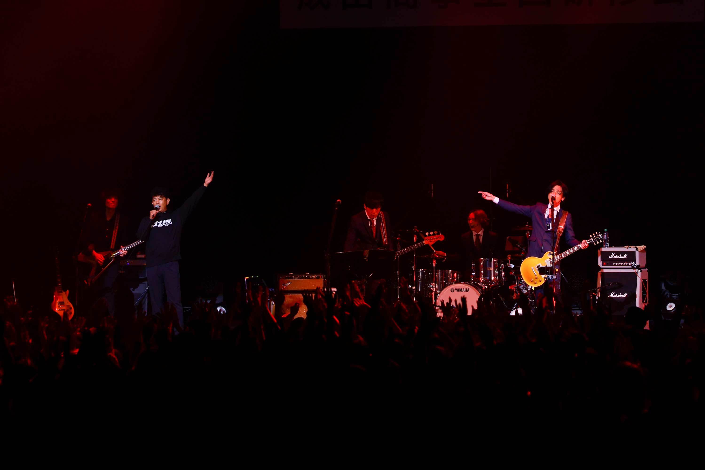 成田、寺岡、青山は、スーツ姿でステージに登場。成田商事のミニアルバムからの曲はもちろん、男闘呼組や過去のソロ楽曲含めた17曲を駆け抜けた。その中で、大阪公演だけのスペシャルゲストとして、10月の再結成公演でも大きな話題となった、男闘呼組の前田耕陽も登場。一緒に「Gimme a Break」の煽りを担当し、会場を盛り上げた。