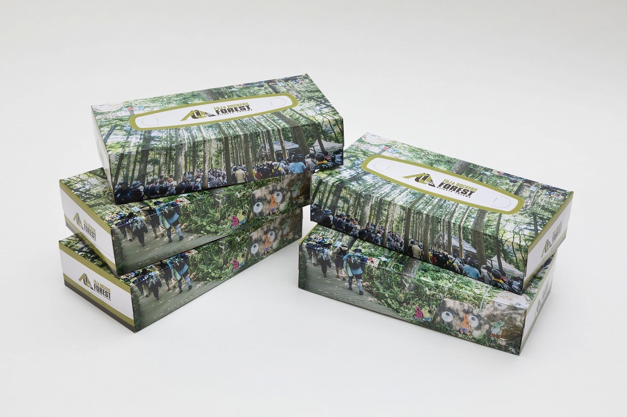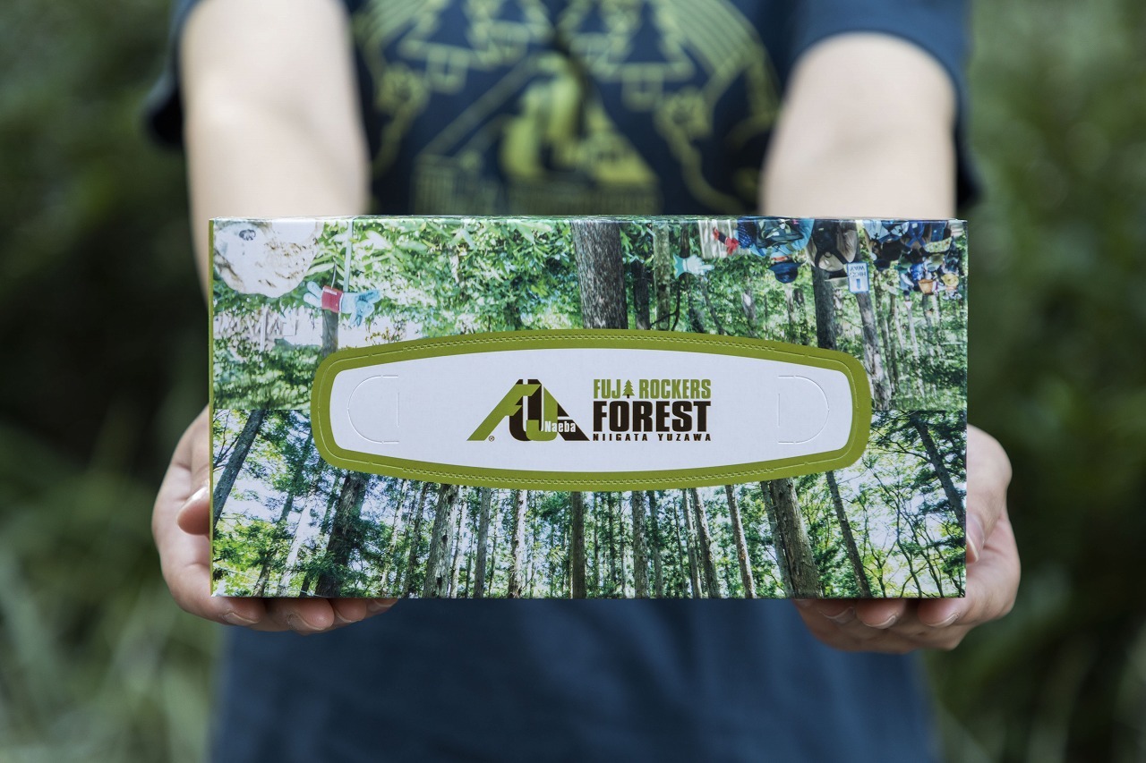 フジロック・ペーパーは、その売り上げの一部を間伐材の搬出経費に還元することにより、地域の森林整備に貢献。これまでにもイベント内でのポスター、フライヤーなどに広く活用してきていたが、今回、新たにフジロック・ペーパーを使用したオリジナルボックスティッシュが制作された。ボックスのデザインには『フジロック』開催時の森の様子をプリント。夏の森の清々しさが思い出されるものになっている。