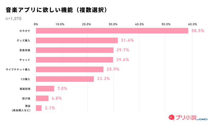 最後に、音楽アプリに追加して欲しい機能のトップは「カラオケ」が過半数以上を占め、さらに「グッズ購入」が3割、「音楽投稿」、「チャット」、「ライブチケット購入」、「CD購入」が2割を占めるなど、好きなアーティストのライブチケットやグッズ購入、そして、コミュニティ機能などを求めていることが明らかになった。