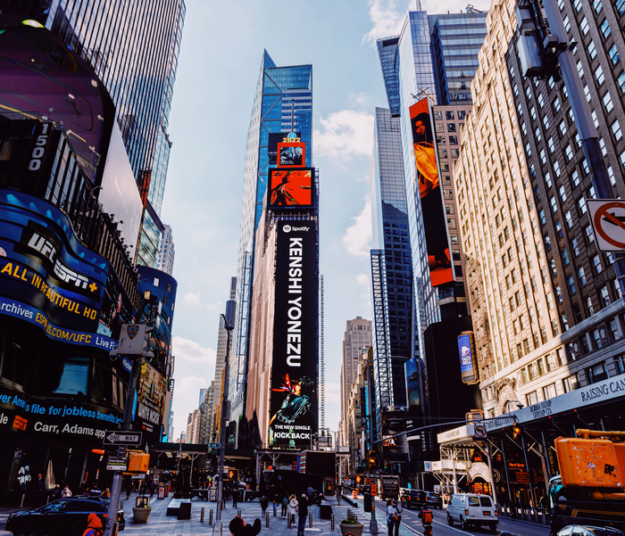 米津玄師を起用したSpotify巨大街頭広告が、ニューヨーク現地時間2022年11月17日、ニューヨーク・タイムズスクエアに登場。米津が描いた「KICK BACK」のジャケットと、チェンソーマンのビジュアルと共に三面を使用して展開された。
