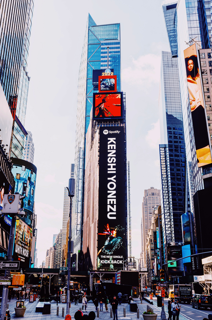 ニューヨーク・タイムズスクエアの広告は縦60メートルにも及ぶ巨大デジタルサイネージで、現地時間11月17日〜19日の間、米津玄師のアーティスト写真、「KICK BACK」ジャケット、「チェンソーマン」のビジュアルを使用した三面仕様。大きく「KENSHI YONEZU」の文字が映し出されている。